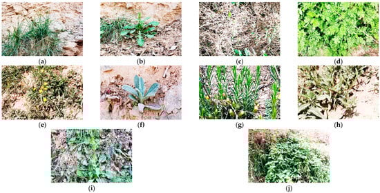 Dominant herbaceous species at Yongning Fortress. (a) Melica scabrosa Trin; (b) Taraxacum mongolicum (1907); (c) Artemisia annua L. (1753); (d) Artemisia capillaris; (e) Convolvulus arvensis (1753); (f) Cirsium arvense (1772); (g) Cymbaria mongolica Maxim (1881); (h) Bothriospermum (1848); (i) Sonchus oleraceus L. (1753); (j) Fallopia aubertii.