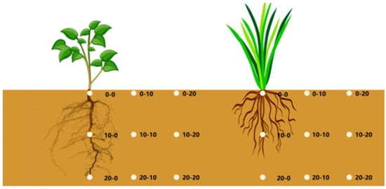 The study implemented a rigorous three-dimensional “Root Influence Zone” sampling model to systematically investigate spatial patterns of root-rammed earth interactions, as depicted in Figure 3. The sampling design incorporated concentric horizontal gradients radiating outward from the center collar axis (point 0; 0) to 10 cm (0–10) and 20 cm (0–20) radial distances, complemented by vertical stratification at 0 cm (surface), 10 cm (intermediate), and 20 cm (deep) depth levels.
