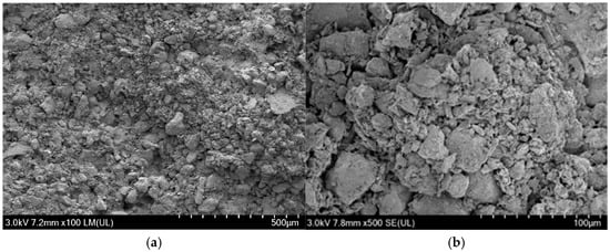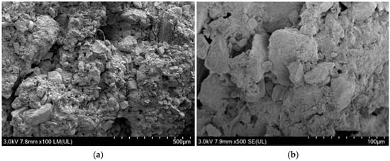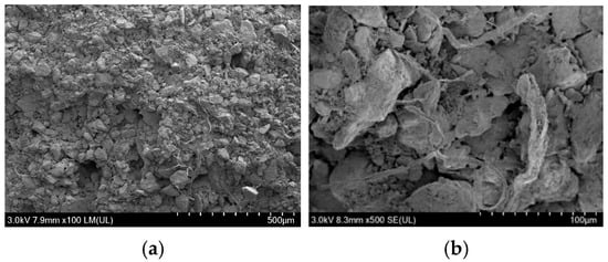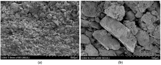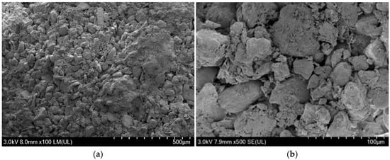 SEM microscopic morphology of rammed earth particles in undisturbed rammed earth. (a) 100×; (b) 500×.