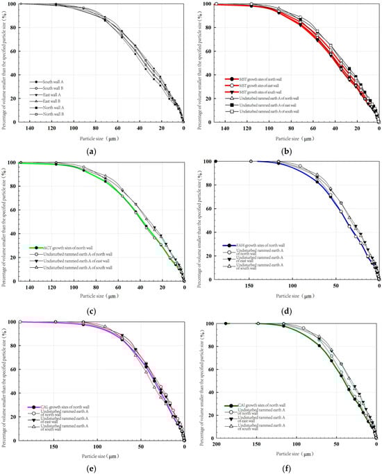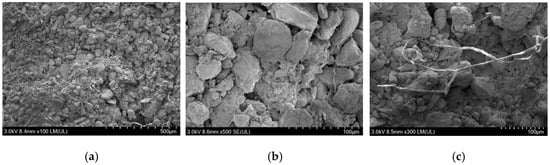 SEM observations of rammed earth samples from MST growth sites at 100× and 500× magnifications are shown in Figure 7. Compared with undisturbed rammed earth samples, the rammed earth particles at MST growth sites appeared looser (Figure 7a), with shapes transitioning from relatively elongated and angular to more rounded irregular particles (Figure 7b). Plant root hairs were interspersed within the rammed earth (Figure 7c), and the particle sizes at MST growth sites were generally smaller than those in undisturbed rammed earth, indicating that rammed earth particle structure had been disrupted by root activity.