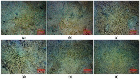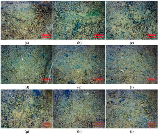 The microscopic morphology of undisturbed rammed earth at different depths was observed using video microscopy and SEM, as shown in Figure 4 and Figure 5. It reveals that there are distinct depth-dependent weathering gradients in the undisturbed rammed earth unaffected by plant roots. The surface layer (0 cm) exhibits a structurally loose fabric attributed to prolonged exposure, the intermediate layer (10 cm depth) displays transitional pore development, and the deep layer (20 cm depth) maintains a dense structure, with localized grayish-white areas indicating calcareous deposits.
