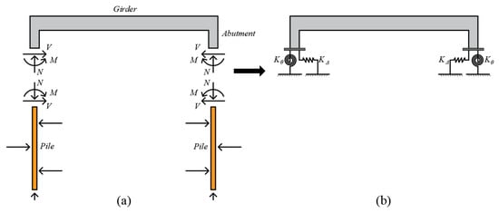 Schematic representation: (a) Free-body diagram of the pile-abutment joint, and (b) Spring model representation.