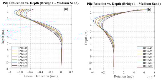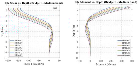 A representative pile behavior obtained from 2D numerical analysis is presented as an illustrative case under selected soil and pile properties. In this analysis, seven different steel H-pile sections (HP10x42, HP10x57, HP12x53, HP12x63, HP14x73, and HP14x89) were modeled interacting with a single soil type, medium sand, under AASHTO HL-93 truck loading conditions. For Bridge I, the corresponding pile responses in terms of lateral displacements and internal forces are shown in Figure 6 and Figure 7, respectively. Figure 6 illustrates the variation in lateral deflection and rotation along the pile length, while Figure 7 presents the corresponding shear force and bending moment distributions. As plotted, the piles develop a characteristic double curvature under the defined vehicular loads. At a certain depth below the ground surface, pile rotation reduces to zero, indicating the location of the inflection point, beyond which the curvature reverses. A second point of zero rotation typically occurs deeper, with its position influenced by both pile stiffness and soil properties.