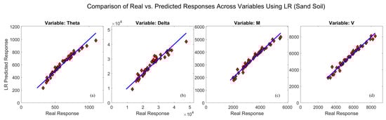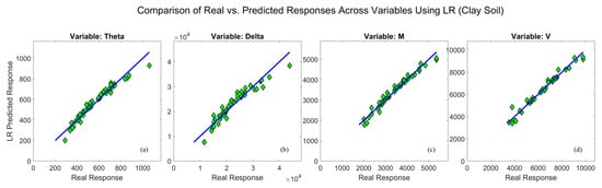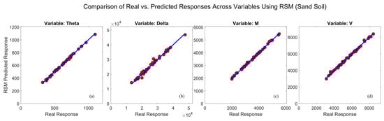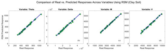 The LR and RSM results exhibit strong predictive capability, with high R2 values obtained across all response variables. For sand soil, LR produced R2 values of 98.84% for θ, 92.73% for Δ, 97.21% for M, and 97.13% for V, which indicates strong accuracy. For clay soil, LR yielded 94.99% for θ, 91.90% for Δ, 96.87% for M, and 97.08% for V, also demonstrating high reliability. RSM further improved predictive performance across both soil types. For sand soil, RSM achieved 99.81% for θ, 98.82% for Δ, 99.58% for M, and 99.78% for V. For clay soil, RSM achieved 99.61% for θ, 99.55% for Δ, 99.79% for M, and 99.79% for V. These values show that while LR provides robust predictive models, RSM attains near-perfect fits for all response variables and thus offers a more reliable representation of nonlinear relationships among the design parameters.