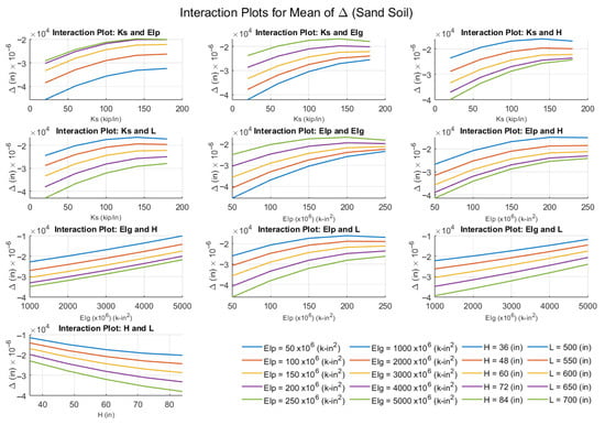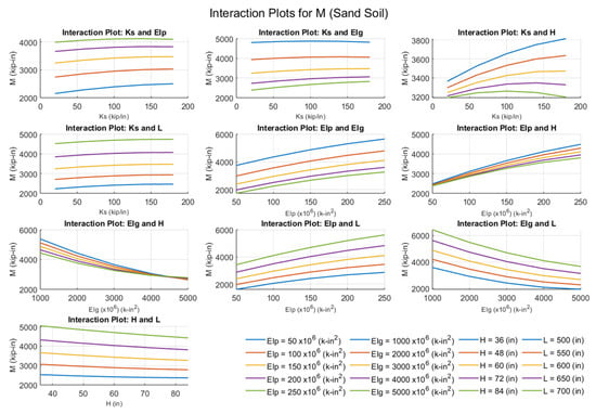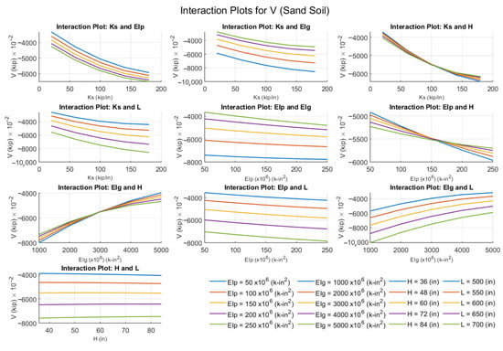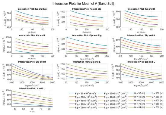 Figure 13, Figure 14 and Figure 15 present interaction plots illustrating how paired variables influence pile-abutment joint responses (θ, Δ, M, and V) in sand-type soil. Each plot shows the mean response at different levels of one factor as the other is varied. Similar trends were observed for clay-type soil and are therefore not shown.