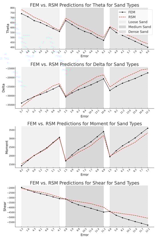For clay types (Figure 18), RSM predictions for rotation response demonstrated high accuracy for soft and medium clay conditions, with error rates below 5% in most cases. However, error rates increased to as high as 17.7% for stiff and very stiff clays. Deflection response predictions showed a clear tendency of increasing error rates with clay stiffness, remaining below 8% for soft and medium clay conditions but reaching 26.8% for very stiff clay. For moment response, consistent prediction accuracy was observed across all clay types, with errors remaining below 12%. Predictions for shear force followed a similar tendency to deflection response, with error rates increasing for stiffer clay types. The highest errors were observed for very stiff clay, exceeding 18%, highlighting potential limitations of the RSM model in capturing shear behavior in high-stiffness materials. Overall, the RSM model performed well for both sand and clay types, particularly for loose sand and soft clay, where errors were minimal. However, challenges were noted in predicting deformation and shear responses for dense sand and very stiff clay.