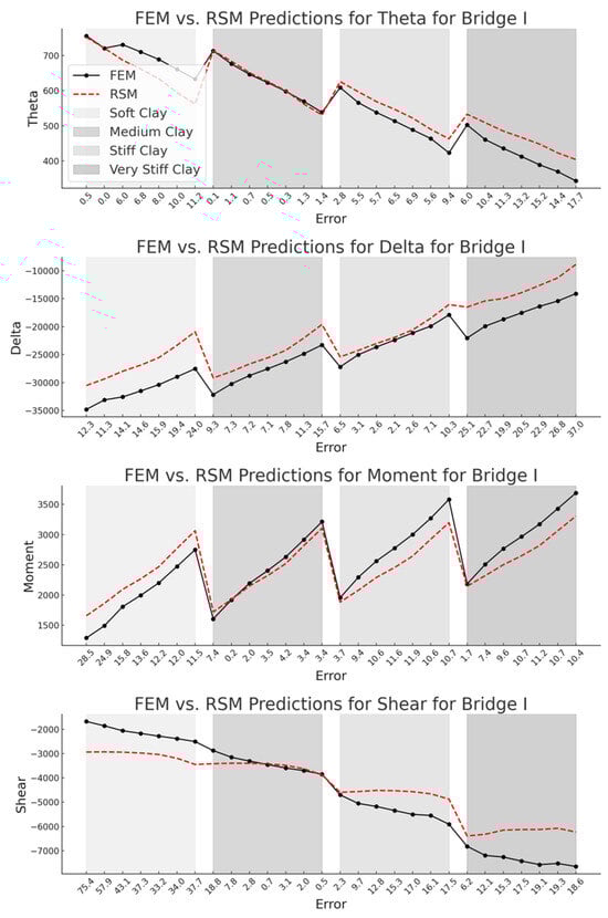 RSM predictions for pile-abutment rotation, deflection, moment, and shear responses of Bridge I were evaluated under varying pile parameters (seven different HP piles: HP10x42, HP10x57, HP12x53, HP12x63, HP14x73, HP14x89) and different soil conditions (sand types: loose sand, medium sand, and dense sand; and clay types: soft clay, medium clay, stiff clay, and very stiff clay). The results, presented in Figure 17 and Figure 18, illustrate the prediction accuracy and numerical error values, categorized by soil type and pile flexural stiffness. For sand types (Figure 17), the errors between RSM and FEM predictions were generally small, with the rotation response for loose sand exhibiting the lowest error range (2.1% to 5.5%). For the medium sand condition, the predictions from the RSM and FEM models showed strong agreement, with most errors remaining below 5%. In contrast, for the dense sand condition, error rates exhibited an increasing tendency, particularly for the deflection response, where the maximum error reached 16.6%. Moment predictions were highly accurate across all sand types, with error rates predominantly below 8%. Shear predictions displayed a mixed tendency, with minimal errors (0.8% to 6.6%) observed for loose sand, while higher errors occurred for medium and dense sands, reaching up to 12.1%. While 2D–3D discrepancies are inherent, the additional LR and RSM approximations introduced only modest error increases, with cumulative deviations remaining below 15% for most soil conditions and response variables. For very stiff soils, cumulative errors may approach 20–27%, which indicates that the models remain within acceptable engineering limits but should be applied with caution in extreme stiffness ranges or for longer spans.