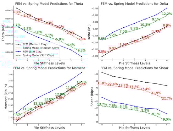 Comparison of FEM vs. spring model predictions for rotation, deflection, moment, and shear for medium and stiff clay.