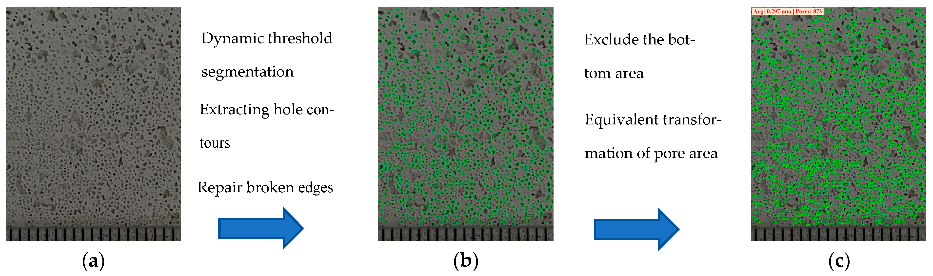 Currently, scanning electron microscopy (SEM) and mercury compression methods are used for the study of the pore size of foam concrete. Arvind et al. [26] tested the pore size distribution of foam concrete by SEM. Ahmed et al. [27] in 2023 used SEM to observe the pore size, and in 2025 [28], used a combination of SEM and mercury compression to analyze the pore size distribution. Considering the problems of the SEM method, this study is based on a high-precision image analysis method with machine vision in order to realize the quantitative characterization of the complex pore structure of foam concrete. The method establishes an automated measurement system suitable for two-dimensional cross-section analysis of porous materials through a technical path combining the construction of an equivalent diameter model and morphological optimization. The study initiates image processing by employing the emphasize operator to enhance image contrast, thereby accentuating edges and details. The image is subsequently converted to grayscale. Dynamic threshold segmentation is then applied to obtain a preliminary segmented region. The edge contours of the target were subsequently extracted using the Canny sub-pixel edge detection algorithm. The smoothing coefficient (Sigma) of the Canny filter was set to 5, and the hysteresis thresholds were configured as [20, 40]. This combined approach of dynamic thresholding and edge detection facilitates the retention of strong edges by the high threshold and the connection of weak edges by the low threshold, resulting in more complete and coherent boundaries. This methodology effectively mitigates issues of under-segmentation or over-segmentation commonly associated with global thresholding techniques, thereby reducing errors in aperture measurements. Subsequent morphological processing involves a closing operation to repair fractured edges. Effective pores are then screened based on compactness (set within the range of [0.4, 1.9]) and area thresholds (set within the range of [20, 99999] pixels). This parameter selection ensures a balance between retaining potential target pores and filtering out obvious noise. To address the issue of misidentification in the calibration scale region at the bottom of the sample, a region selection method based on spatial domain coordinates was employed to exclude the bottom 11.7% area of the image. This method involves generating a rectangular mask within the spatial domain and subsequently removing the interfering bottom region through a set difference operation. The equivalent diameter model ( D e q = 2 A / π ) is used to equivalently convert the area of holes to a standard circle diameter to overcome the geometric characterization difficulties of irregular hole shapes, and is then combined with the calibration scale factor to realize the physical size conversion. The recognition process of hole diameters is shown in Figure 1.