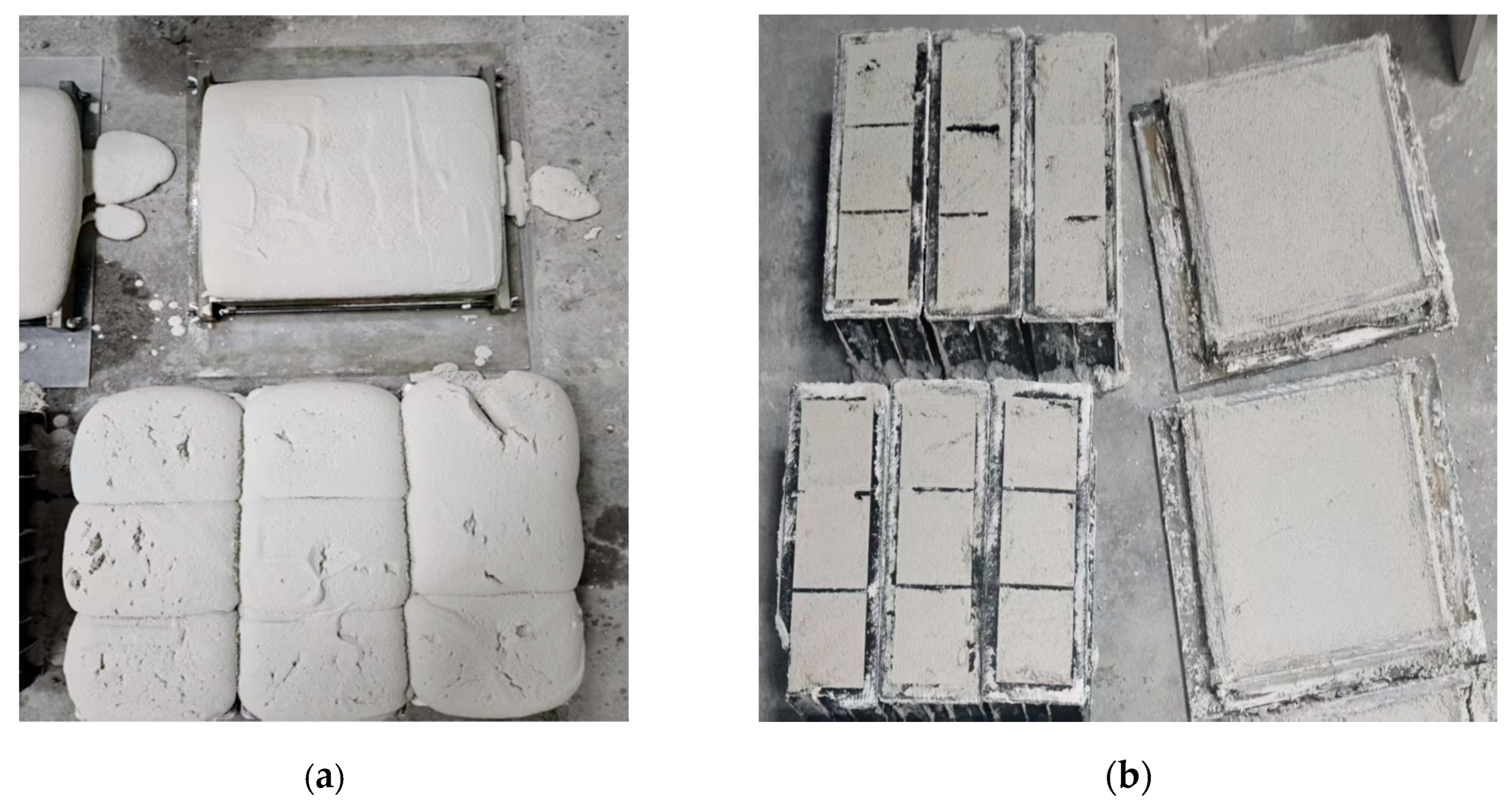 Figure 2. The production process of GFC: (a) GFC fully foamed; (b) GFC surface cutting treatment.