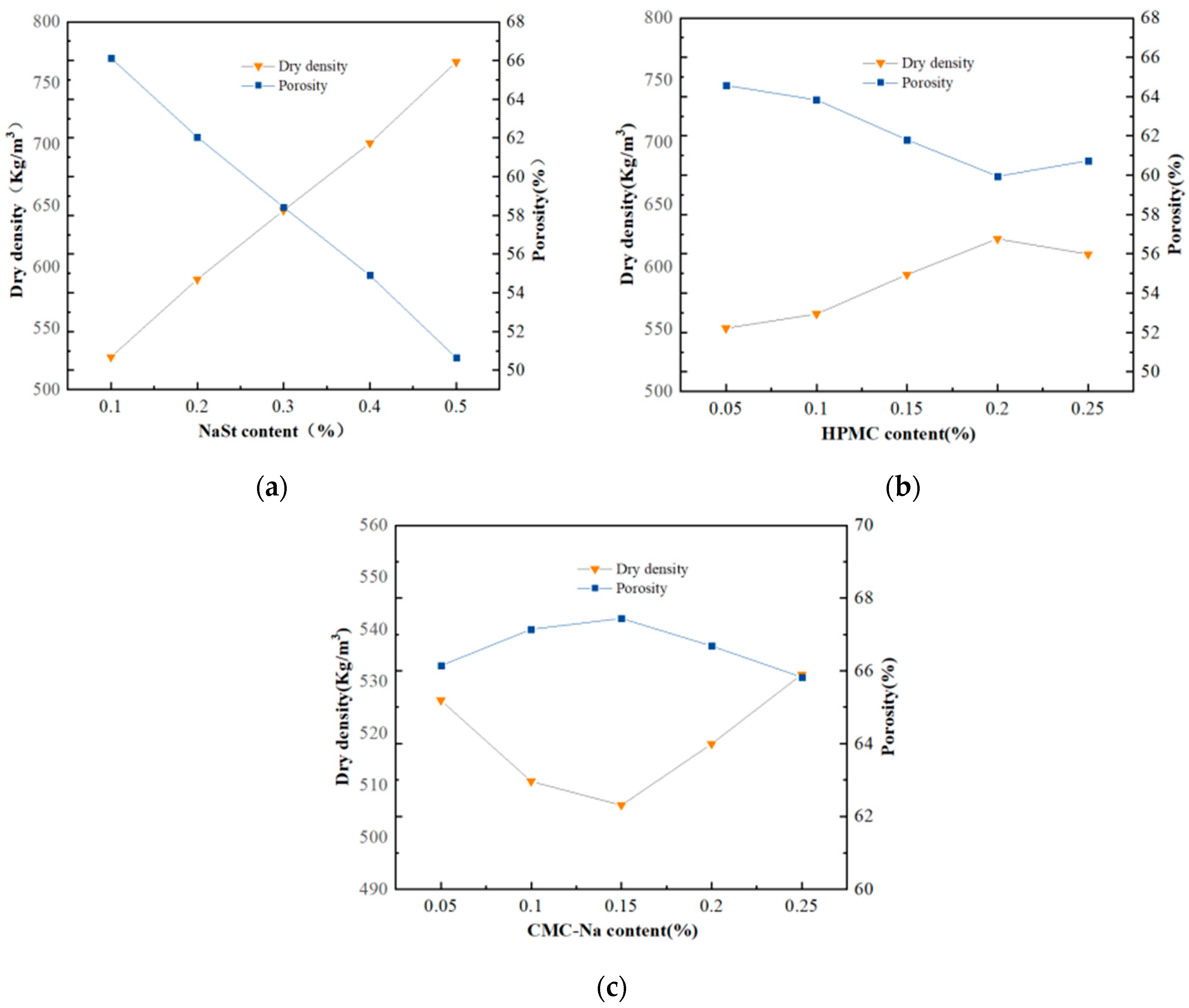 The dry density and porosity of GFC with different NaSt, HPMC, and CMC-Na contents are shown in Figure 3. The dry density of GFC reached 526.5 kg/m3 and the porosity reached 66.13% when NaSt content was 0.1%, and with the increase in mixing amount to 0.2%, 0.3%, 0.4%, and 0.5%, the dry density increased by 12.04%, 22.72%, 33.14%, and 41.92% to 589.9 kg/m3, 646.1 kg/m3, 701 kg/m3, and 747.2 kg/m3, and the porosity decreased to 62.05%, 58.43%, 54.90%, and 51.93%, respectively.