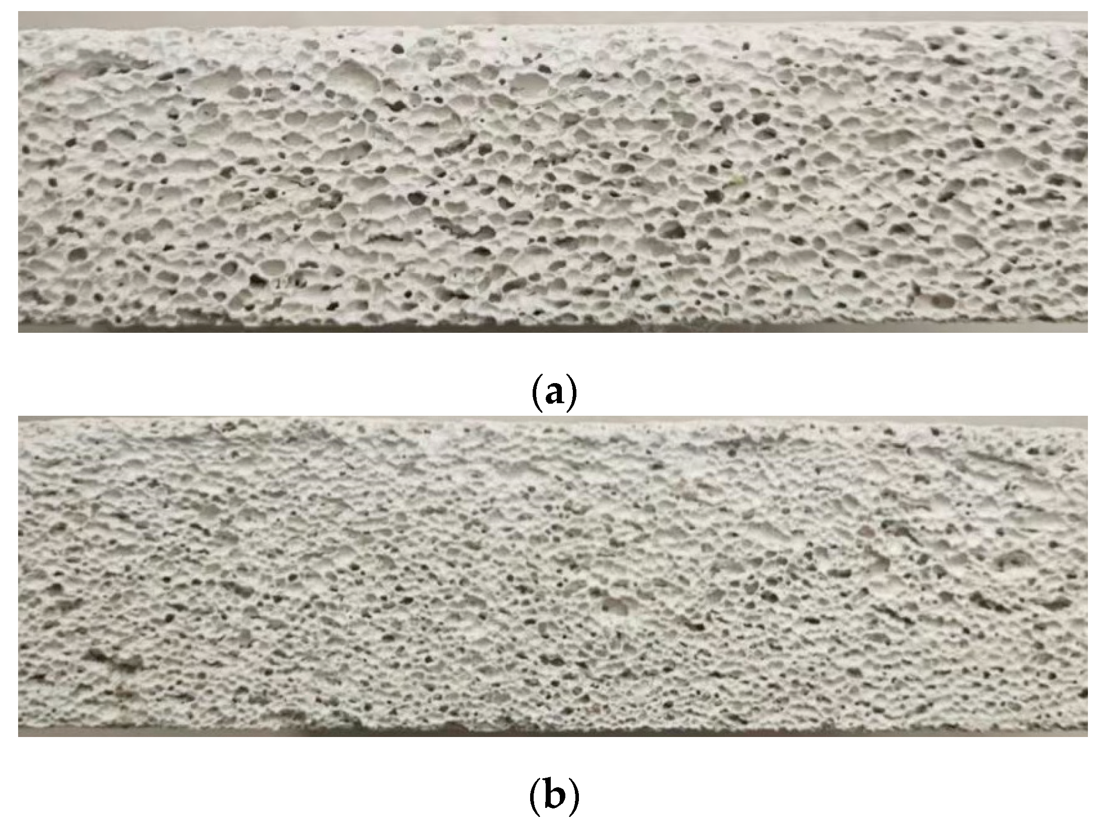 The water glass modulus was adjusted to 1.4 by adding sodium hydroxide, the liquid-to-solid ratio was set to 0.53, the alkali content was set to 10%, and the hydrogen peroxide doping was 5.5%. The alkaline activator was prepared by mixing NaOH, the water glass solution, and tap water proportionally, and left to age for 24 h before use. The granulated blast furnace slag powder was mechanically premixed for 120 s to achieve homogeneous dispersion of the material, then injected into the prefabricated alkaline activator and foam stabilizer, then placed in the mortar mixer for 60 s with high-speed mixing, and finally added into hydrogen peroxide for rapid mixing before being injected into the standard mold immediately after the completion of the mixing and the fluid slurry to be shaped, finally producing the GFC; the produced foamed concrete is shown in Figure 2. Based on the dosage of foam stabilizers used in the local polymer foam concrete by Shi et al. [29] and previous experimental studies, three dosage levels of stabilizers were determined. Specifically, NaSt and HPMC were used at 0.10%, 0.20%, 0.30%, 0.40%, and 0.50% of the total weight, while CMC-Na was applied at 0.05%, 0.10%, 0.15%, 0.20%, and 0.25% of the total weight. The mix design of the specimens is detailed in Table 2.