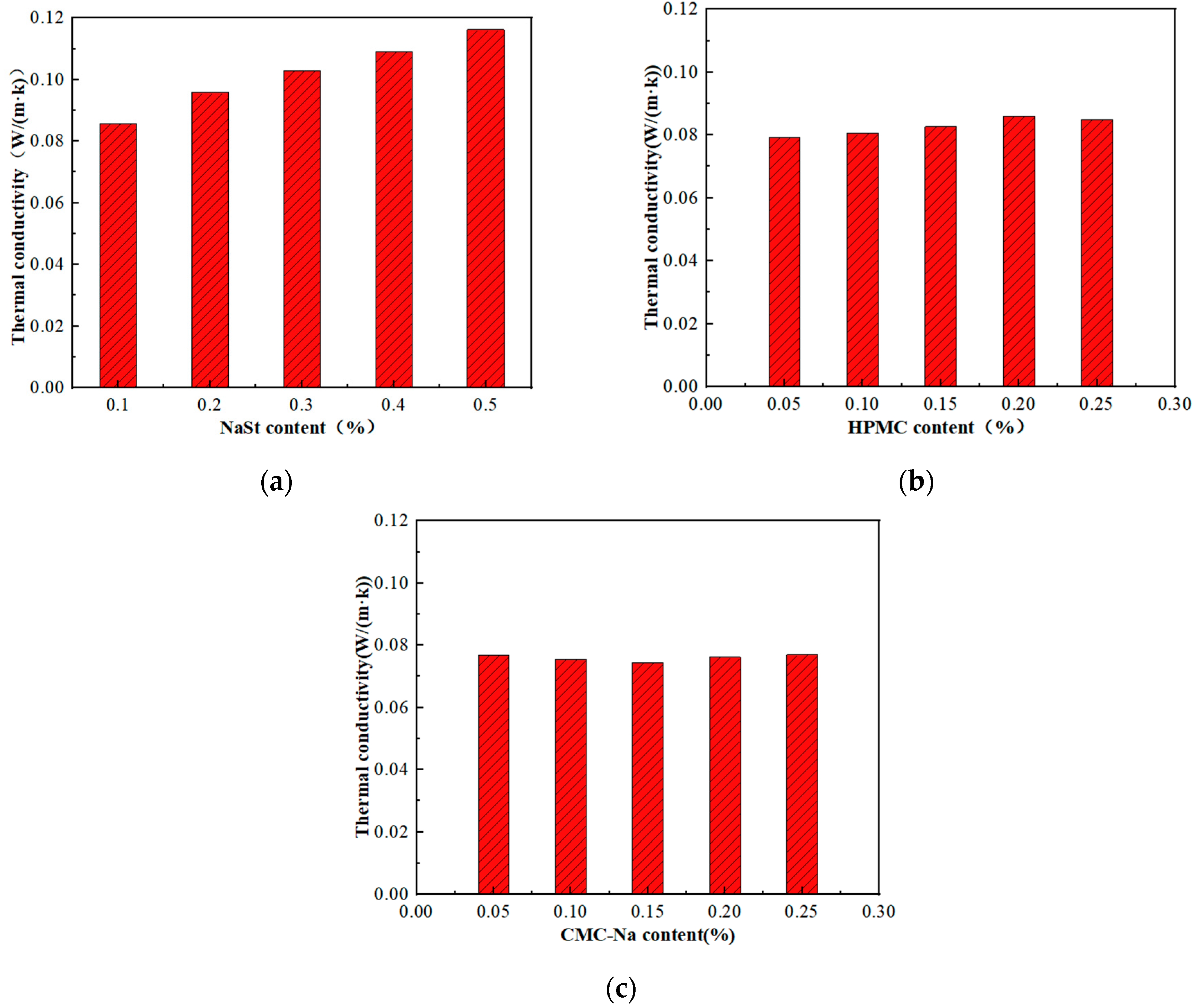 The thermal conductivity of GFC with different NaSt, HPMC, and CMC-Na contents is shown in Figure 5. The thermal conductivity of GFC was 0.08578 W/(m·k) at 0.1% NaSt content, and as the mixing amount was increased to 0.2%, 0.3%, 0.4%, and 0.5%, the thermal conductivity increased by 17.39%, 21.15%, 25.94%, 27.91% to 0.10070 W/(m·k), 0.10392 W/(m·k), 0.10803 W/(m·k), and 0.11035 W/(m·k). The thermal conductivity of GFC was 0.07924 W/(m·k) for HPMC content of 0.05%, and increased by 1.6%, 4.3%, 8.5%, and 7.3% with the increase in admixture amount up to 0.1%, 0.15%, 0.2%, and 0.25% to 0.08052 W/(m·k), 0.08268 W/(m·k), 0.08598 W/(m·k), and 0.08502 W/(m·k), respectively. The thermal conductivity of GFC with CMC-Na content of 0.15% was 0.07438 W/(m·k), with the contents of 0.05%, 0.10%, 0.20%, and 0.25%, corresponding to thermal conductivity of 0.07686 W/(m·k), 0.07552 W/(m·k), 0.07620 W/(m·k), and 0.07705 W/(m·k), respectively. Compared to the NaSt control group, the GFC with CMC-Na and HPMC has better thermal conductivity, which shows that the viscosity stabilizer has a better effect than the synergistic stabilizer in improving the thermal conductivity, and the change in viscosity stabilizer dosage has a smaller effect on the thermal conductivity.