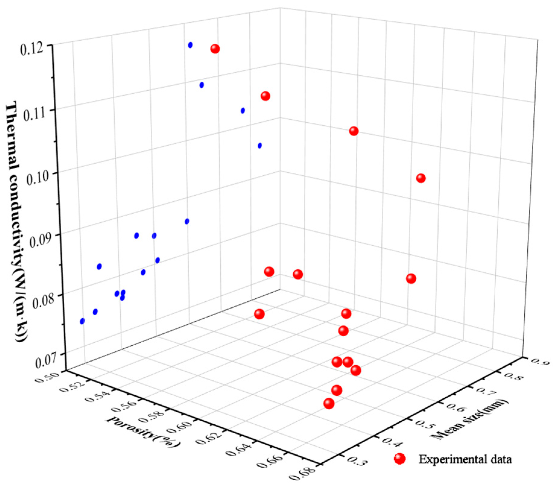 Figure 6. Scatter plot distribution of experimental data. (The blue part is the projection of the thermal conductivity in the pore diameter direction.)