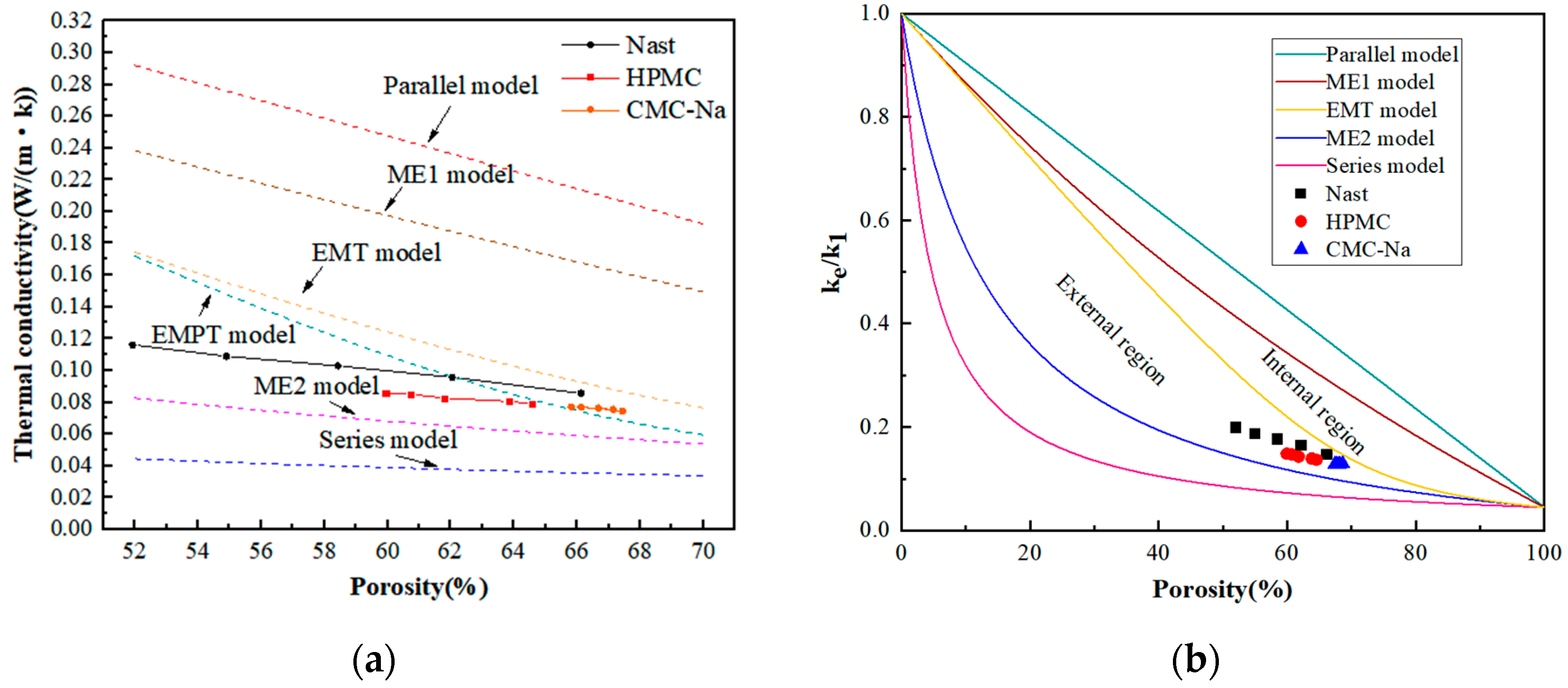 A comparison of the traditional structural model of the relationship between porosity and thermal conductivity of GFC with different stabilizer dosages is shown in Figure 7a. Meanwhile, in order to show the structural model of the GFC more clearly, the relative thermal conductivity ( k e / k 1 ) model is plotted as shown in Figure 7b, where the porous material is divided into internal and external porous materials by Carson et al. [30].