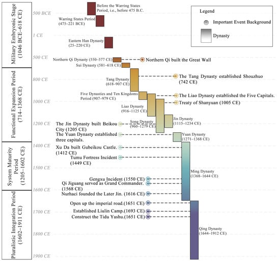 | Military Embryonic Period | Zhou to Sui Dynasties (1046 BCE–618 CE) | Military and cultural collisions between regimes formed the cultural keynote of this stage, with the Northern Qi Dynasty constructing the earliest military landscapes. |