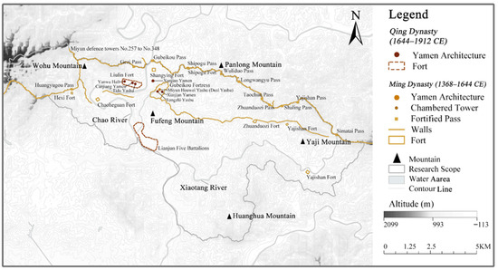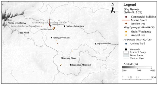 - Bai, J.; Bian, J.; Wang, Z.; Yuan, S.; Mu, N.; Xiao, T. Resource supply and demand model of military settlements in the cold weapon era: Case of Zhenbao town, ming great wall. Herit. Sci. 2024, 12, 318–389. [Google Scholar] [CrossRef]