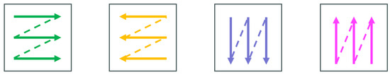 where represents the RVSS module. Different from the Visual State Space module [35], the RVSS module can model global dependencies while simultaneously introducing high-frequency features to enhance texture representation. The RVSS module is comprised of Layer Normalization, a High-frequency Fused SS2D (HF-SS2D) module, and a Feed-Forward Network (FFN). Layer Normalization is employed to standardize the data distribution, and the FFN is used to integrate features. The RVSS module adopts a sequential scanning strategy combined with a state space module to model global dependencies, while incorporating high-frequency textures to further refine the global modeling. Similar to the Visual State Space module [35], the RVSS module adopts a four-directional scanning strategy to capture sequential relationships across different patches, as illustrated in Figure 2: