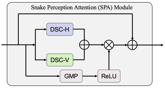 Fusing multi-scale features of the encoder and decoder through skip connections is a commonly used technique in the encoder–decoder architecture [38]. It can complement deep features with spatial textures and improve segmentation performance. However, for crack images, due to numerous uncertain interference factors in the shooting environment, directly merging shallow and deep features may cause the continuity of cracks to be disrupted by noise. Therefore, inspired by the morphological structure of cracks, we specifically design a Snake Perception Attention (SPA) module to filter noise and highlight texture information from both spatial and channel dimensions, as shown in Figure 3.