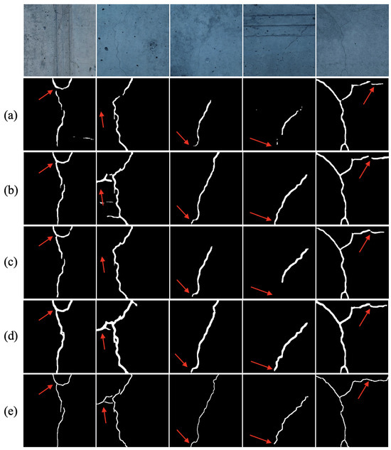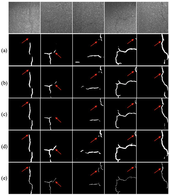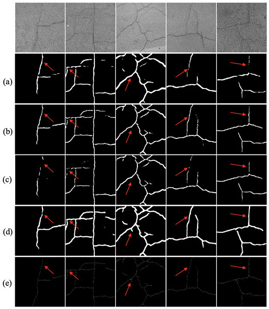 Comparison of HFR-Mamba with SOTA methods on the CrackTree200. (a) DECSNet. (b) Swin Transformer. (c) CarNet. (d) HFR-Mamba. (e) Label. Arrows mean the distinguishing areas.