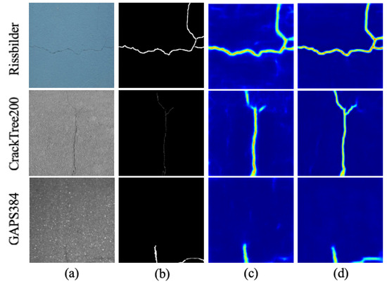 CrackTree200 Dataset [42]. The CrackTree200 dataset contains 175 images of cracks collected from pavement and building surfaces, along with manually annotated label images. The original resolution of the images is . The proportion of crack pixels in the images is relatively low, approximately 0.31%. Additionally, the images in this dataset contain interference factors such as shadows, occlusions, low contrast, and noise. For the division of the training, validation, and test sets, we followed a 6:1:3 ratio.