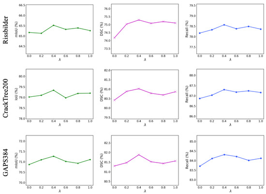 We also conducted the corresponding ablation study for the hyperparameter . As shown in Table 5, adding extra supervision to the decoder’s layer features led to a further improvement. We also conducted ablation experiments on the weights of the supervisory branch in the decoder. As shown in Figure 8, through comparison, we found that when is set to 0.4, HFR-Mamba performs best across the three public datasets. This is because the higher weight for Dice Loss encourages the model to focus more on the overall integrity and consistency of the target region, which performs better for imbalanced data. Meanwhile, the lower weight for Cross-Entropy Loss ensures the proposed model maintains accuracy in boundary details without overfitting, thus improving the overall region segmentation. This setting helps enhance the overall performance of crack segmentation tasks, especially when dealing with complex backgrounds.