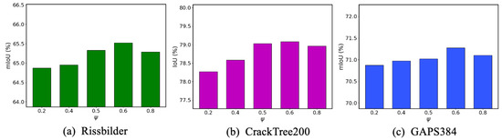 To explore the optimal fusion strategy of spatial and frequency domain features, we compared three methods: pixel-wise addition, tensor multiplication, and weighted fusion. As shown in Table 6, we observed that by multiplying the aforementioned features, HFR-Mamba achieved IoU, DSC, Recall, Accuracy, and Precision scores of 78.82%, 80.07%, 86.45%, 99.71%, and 78.13%, respectively. Next, we experimented with adding the two feature sets together and found a slight improvement in segmentation accuracy. Subsequently, we employed a weighted fusion strategy to combine the two feature sets. We compared three strategies: emphasizing the frequency domain while weakening the spatial features (EFWS), equalizing the frequency and spatial features (EFS), and weakening the frequency domain while emphasizing the spatial features (WFES). We set the weight of the high-frequency branch as . As shown in Figure 9, when , the proposed method shows relatively lower performance on the three public datasets. This indicates that the fusion approach, which amplifies spatial features while reducing the importance of frequency domain features, is not suitable for crack segmentation tasks. This is because the spatial domain may contain background and noise, and amplifying these features can interfere with the semantics in the high-frequency features. In contrast, when , the proposed method performs better on the three public datasets. This once again confirms the necessity of introducing high-frequency features. Additionally, we observed that when , the performance of the proposed method was better than when . This suggests that excessively amplifying frequency domain features while compressing spatial features can also negatively affect the segmentation performance. Since we only introduce high-frequency features while discarding low-frequency features, this inevitably leads to the loss of some background-related semantics, thereby impacting the model’s ability to recognize the contextual features of the cracks. Therefore, when , the encoder is able to effectively fuse spatial features and high-frequency semantics, improving the segmentation performance.