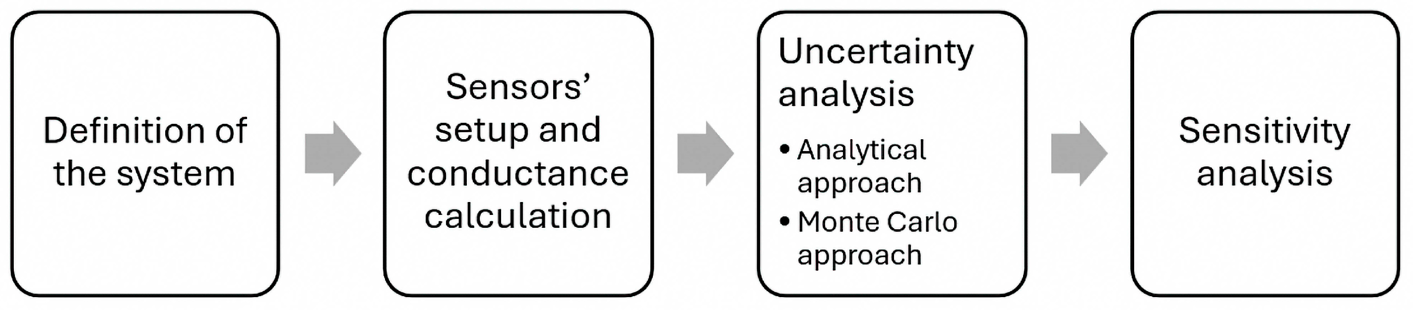 - Definition of the expected measurement:The expected conductance value is used to calculate the corresponding heat flux mean, with the formula in Equation (7).Since only the temperature difference affects the result, the absolute values of the surface temperatures are not significant in this context.