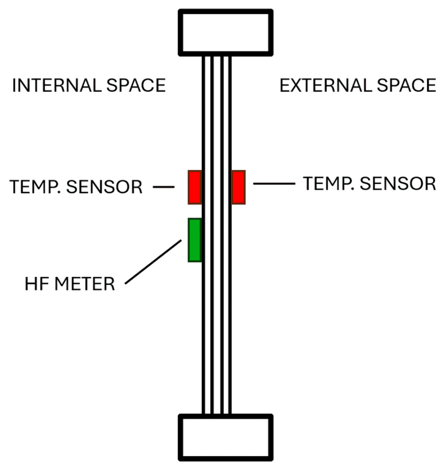 - Standard Heat-Flux Meter (HFM) methods (ISO 9869-1 [18], “average” and “dynamic” analyses). In this method, a heat-flux meter is positioned on the internal surface of the wall, while two temperature sensors record the internal and external air temperatures. The measurement campaign extends for a minimum of 72 h to ensure the attainment of stable results, although it may extend longer until consistent data is achieved. This is due to the standard being intended for systems like opaque masonry façades with high-inertia walls [19,20]. The extended duration of this process can significantly impact operational costs, thereby potentially discouraging its implementation. The standard includes a method for lightweight structures, requiring only night-time measurements over at least three consecutive nights. However, it mainly applies to opaque, inertial systems and is not explicitly applicable to transparent envelopes. According to the standard, the U-value is calculated over the measurement period as per Equation (1).