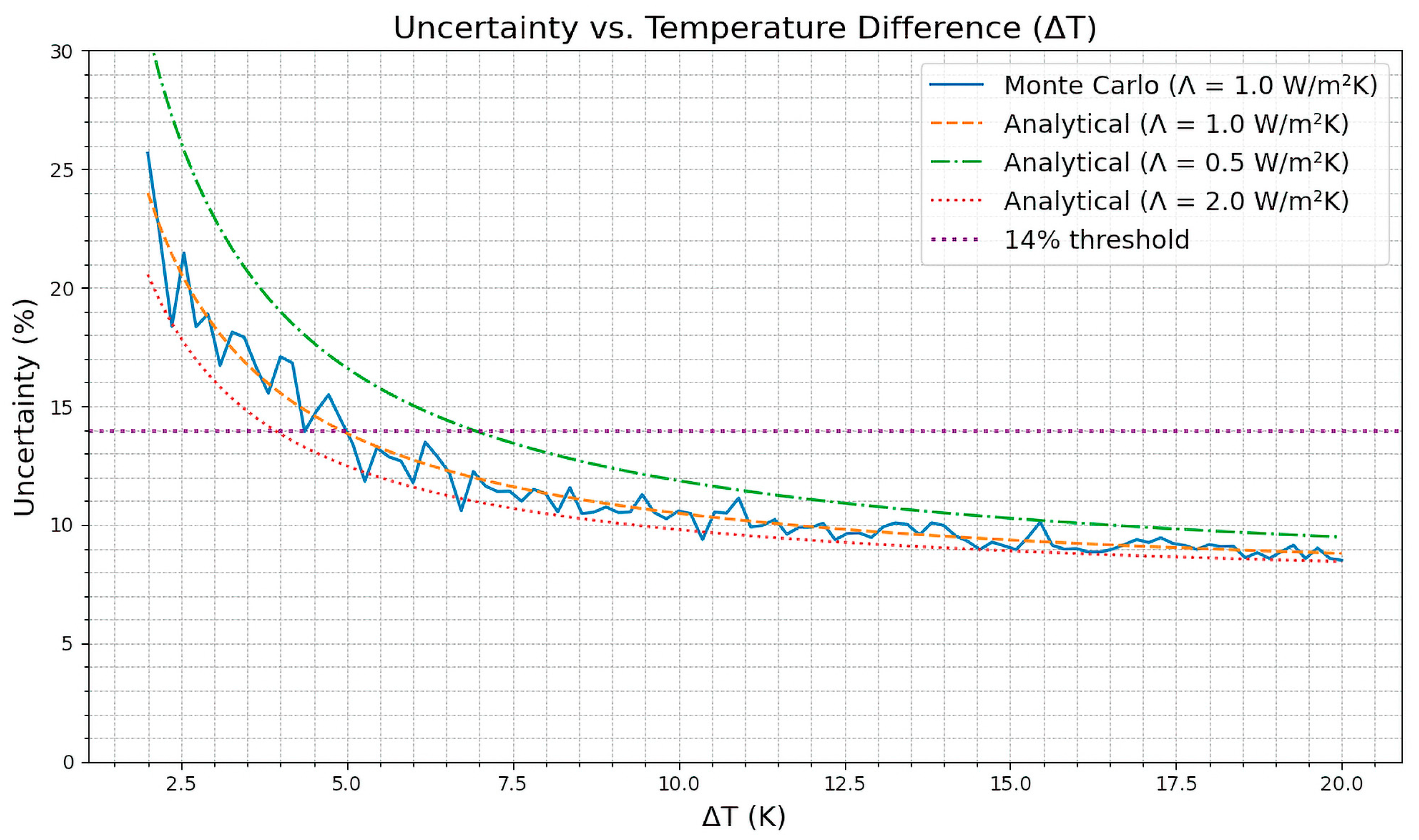 - Temperature difference (ΔT = 7.0 K): This is a representative value for real experimental setups for winter periods in mild climates, ensuring sufficient temperature contrast for meaningful conductance measurements without introducing excessive gradients that could lead to additional uncertainties.