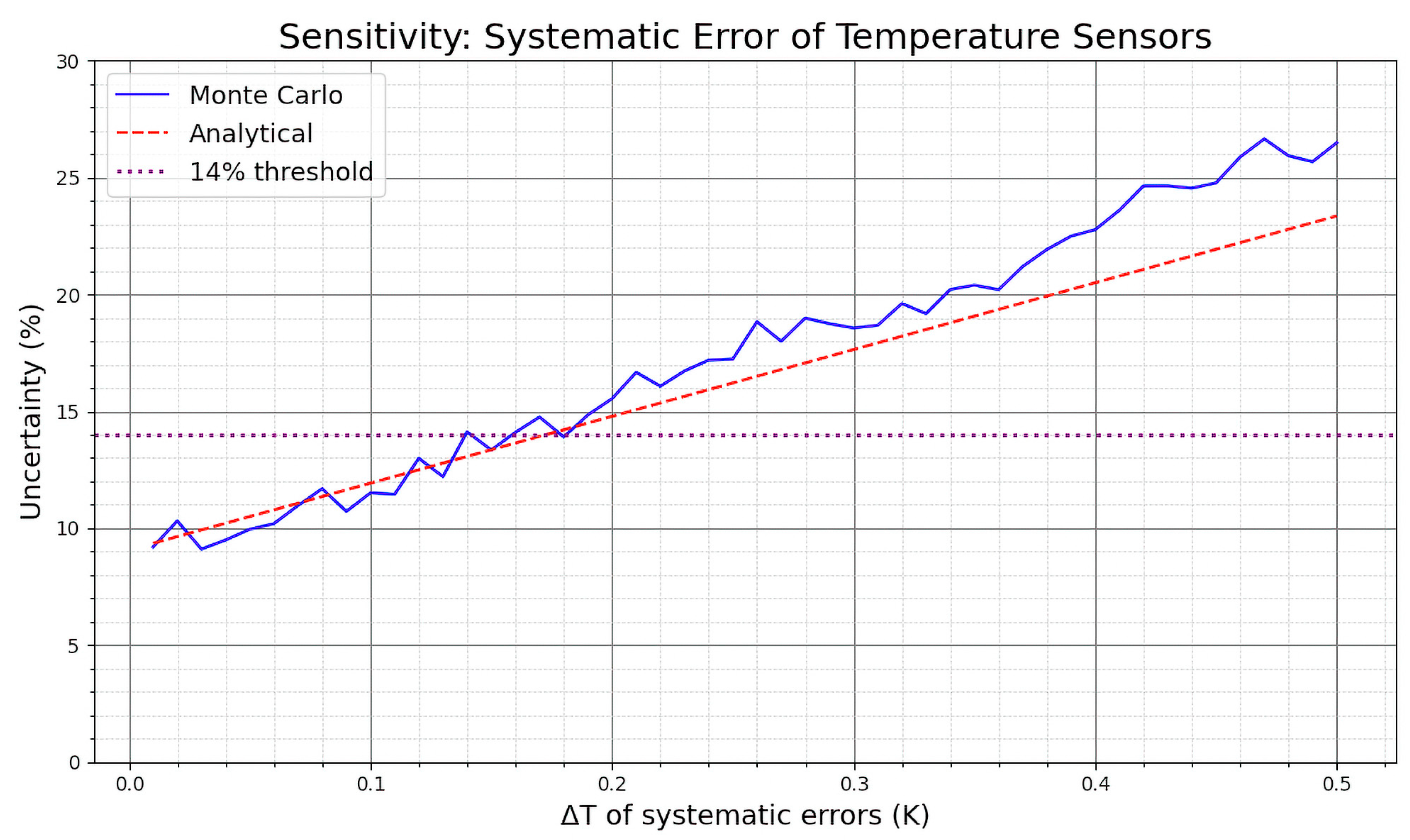 - Systematic error of temperature sensors (0.1 K): This value reflects the typical accuracy associated with laboratory-grade sensors, such as a PT100.