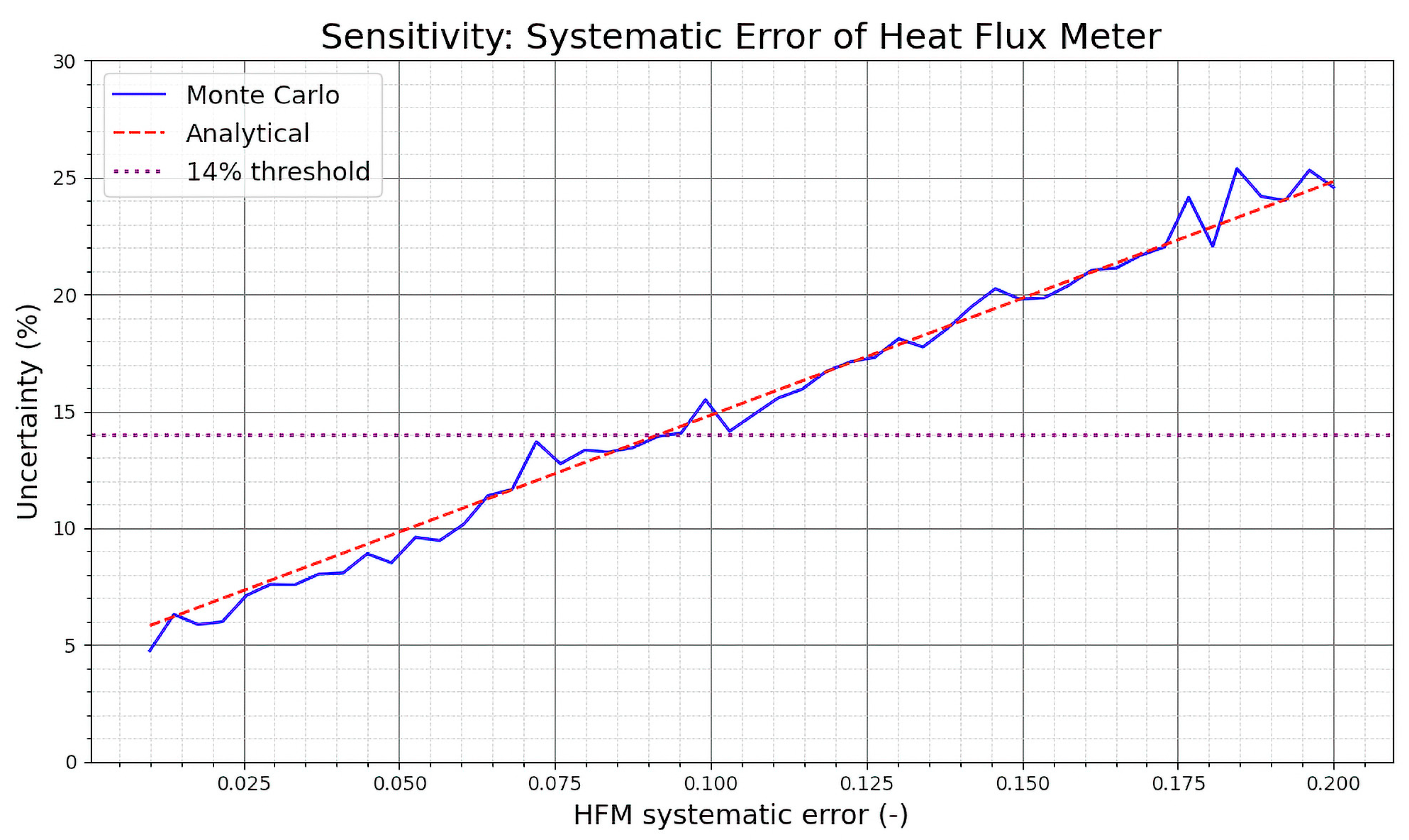 - Systematic error of the heat flux meter (7.1%): This value is derived from an estimation using the uncertainty values reported in ISO 9869-1, which specifies typical sources of systematic error. The overall error is composed of just two elements: a 5% calibration error, which reflects the performance of a well-calibrated, high-quality sensor, and a 5% installation error arising from contact resistance. Applying the quadratic sum method, the total systematic error results in approximately 7.1%.