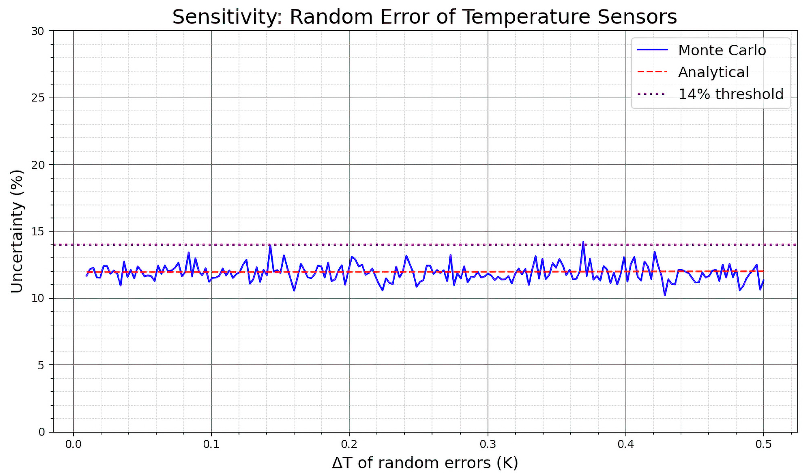 - Noise of temperature sensors (0.07 K): This value was determined based on a previous experimental campaign conducted by the authors [43], involving PT100 sensors. A moving average filter was applied to the time series data to remove low-frequency trends, and the standard deviation of the residuals was computed, yielding an estimate of the noise floor.