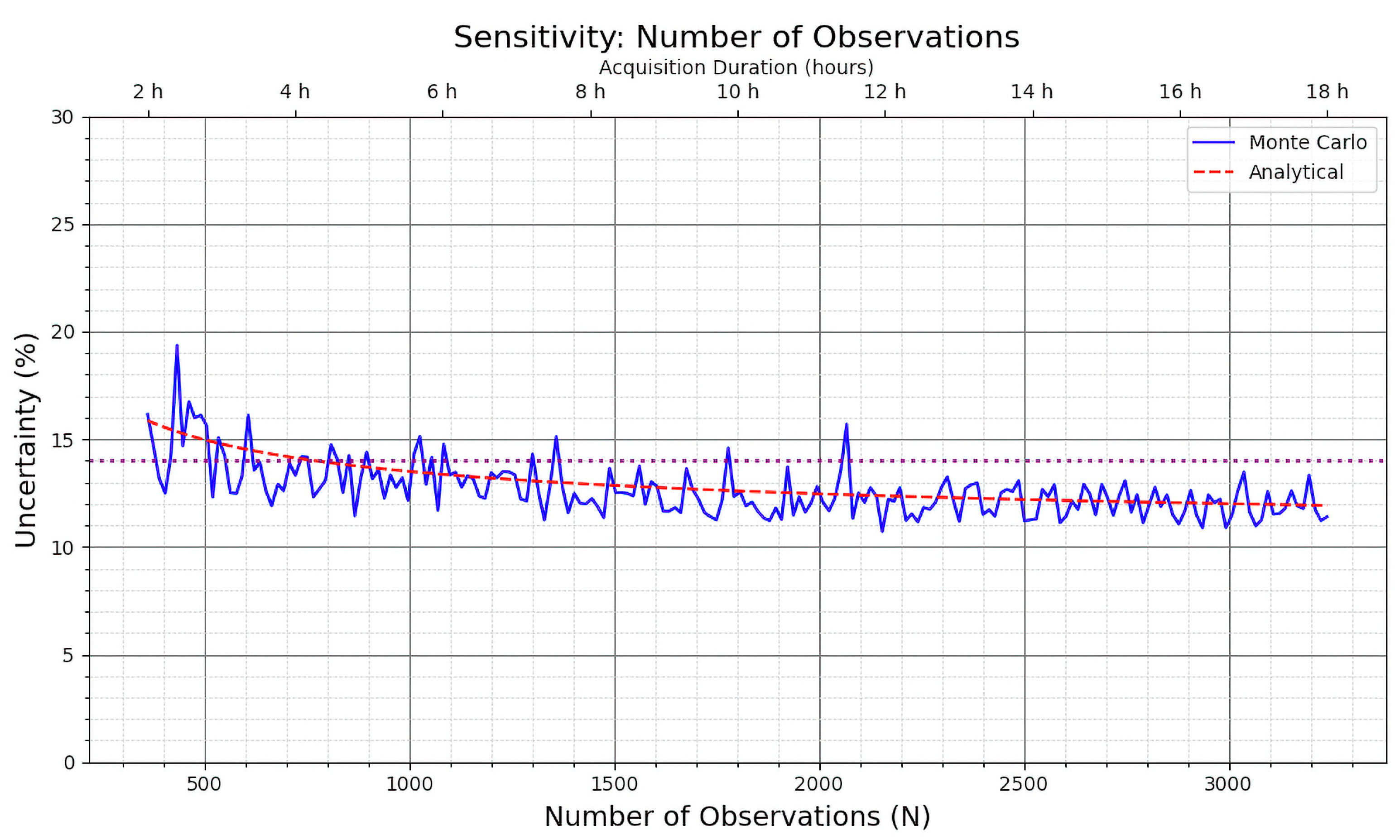 - Number of simulated measurements (n = 1080): A logging system collecting data at a frequency of one measurement every 20 s results in this number of simulations over a 6 h period. This quantity provides a sufficient statistical sample for Monte Carlo simulations and spans a full night of measurements.