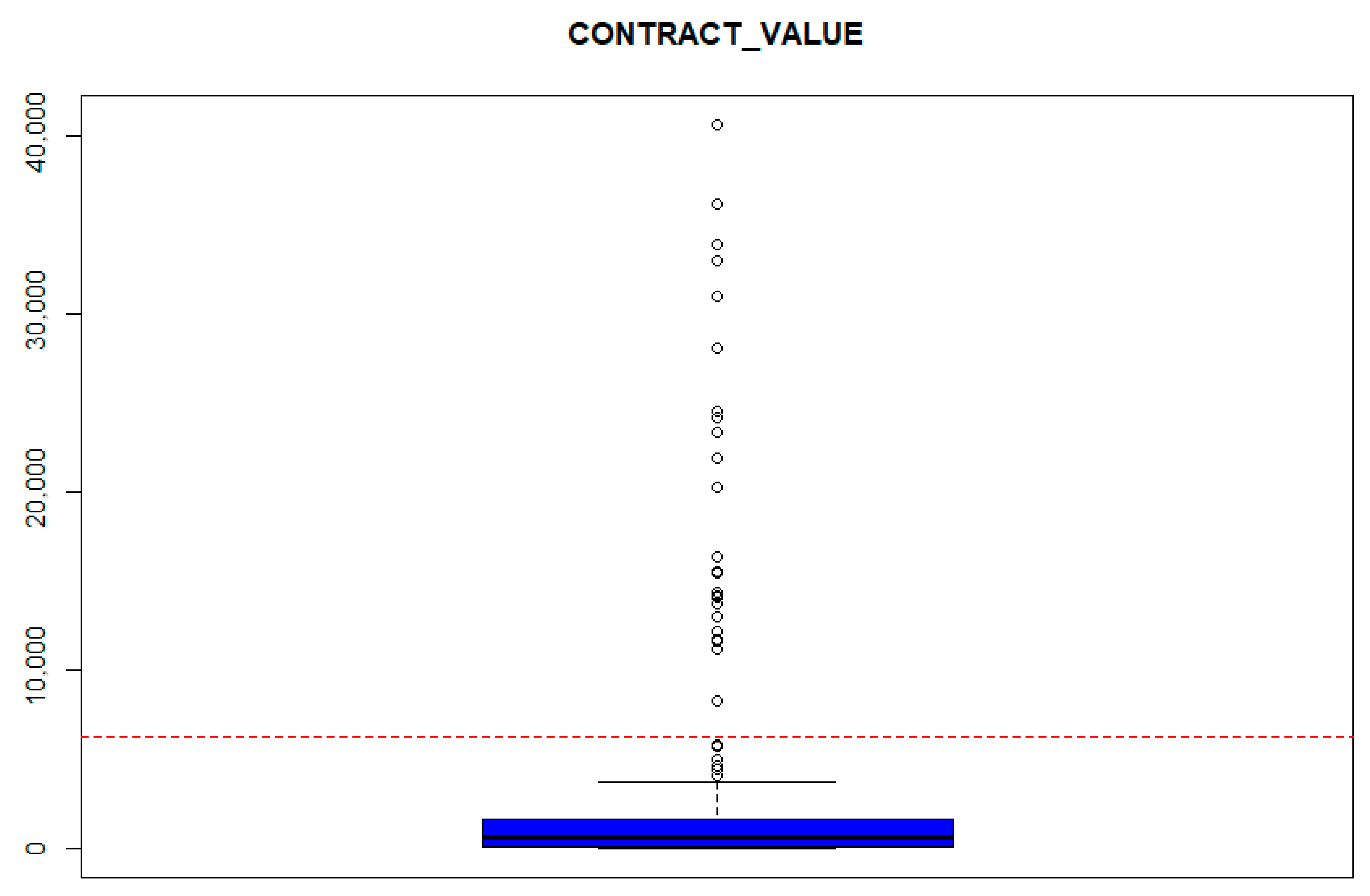 For the numerical variables, statistical measures such as minimum, maximum, average, and median were calculated. Additionally, histograms and boxplots were created to analyze their distribution. This analysis enabled the identification of outliers that could potentially skew the results; these outliers were examined individually for each variable. Regarding the presence of outliers, the research team decided to eliminate the extreme outliers in the contract value variable, specifically those observed above the red dotted line. This decision was made considering the importance of including similar projects and the significant differences in project sizes. See