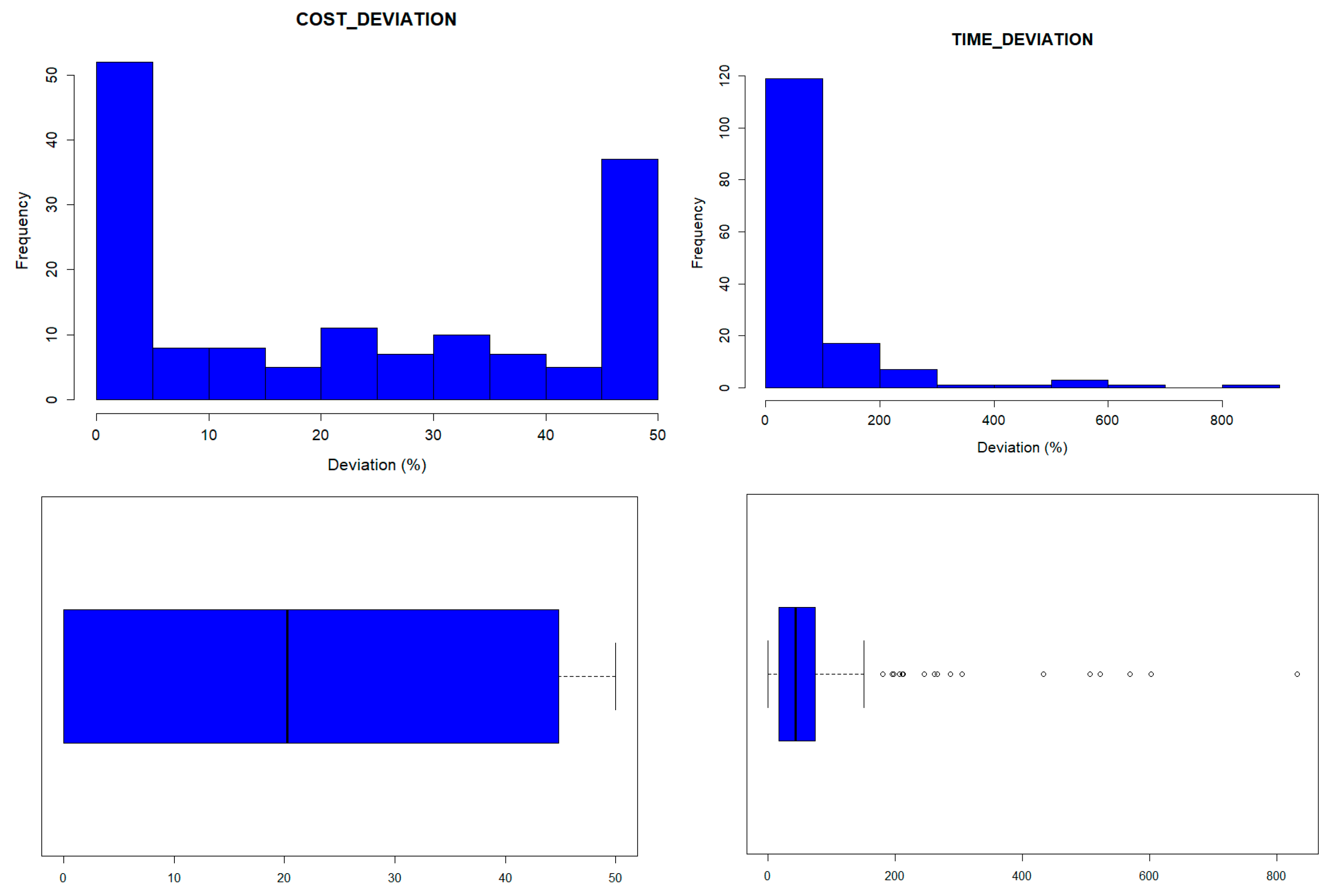 Histograms and Boxplot diagrams were used to analyze the behavior of these variables and to identify outliers. A significant difference between these two variables can be observed, particularly in the presence of outliers, only for time deviation. The plots for cost deviation illustrate the distribution of cost variations across educational infrastructure projects. Two prominent peaks are observed at 0% and 50% deviation, indicating that a large number of projects either strictly adhered to their original budgets or reached the maximum legally permitted deviation in Colombia. Intermediate values (10%, 20%, 30%, and 40%) show significantly lower frequencies, which may reflect the influence of regulatory constraints and budgetary control practices. The plots for time deviation show the distribution of percentage deviations across the dataset, ranging from 0% to 800%. The data reveal a strong concentration of observations within the 0–100% deviation range, suggesting that most time-related measurements remained relatively close to their expected values. This pattern indicates generally consistent performance, with only a minority of cases exhibiting significant deviations. See