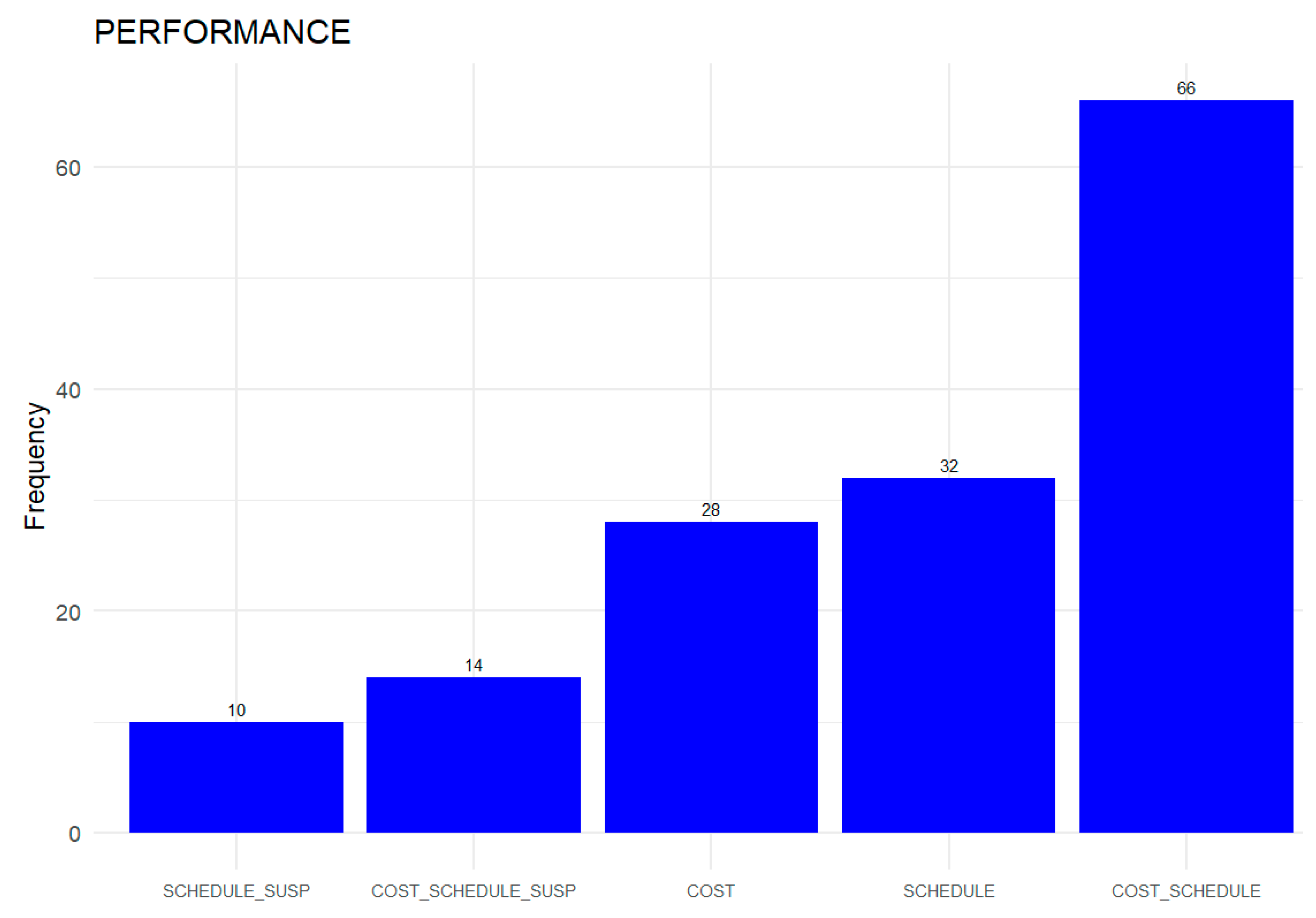 The COST_SCHEDULE category (66 projects) is the most frequent, indicating that a majority of projects experienced both cost and schedule deviations. The SCHEDULE category (32 projects) shows that a significant number of projects had schedule deviations only, even when costs remained within expected limits. The COST category (28 projects) represents projects with cost deviations alone, which were also prevalent, though slightly less than schedule-only deviations. The COST_SCHEDULE_SUSP category (14 projects) includes those that faced all three issues—cost overruns, schedule delays, and suspension periods—highlighting severe performance problems. Finally, the SCHEDULE_SUSP category (10 projects) is the smallest group, consisting of projects that experienced schedule delays along with suspension time, but without cost deviations. The high number of projects with both cost and schedule deviations suggests that these issues often occur together, possibly due to poor planning, underestimation, or external factors. Suspension-related categories (SCHEDULE_SUSP and COST_SCHEDULE_SUSP) are less frequent but still notable, indicating that interruptions in execution contribute to performance problems. Projects with only one type of deviation (COST or SCHEDULE) are common, but less so than those with combined issues.