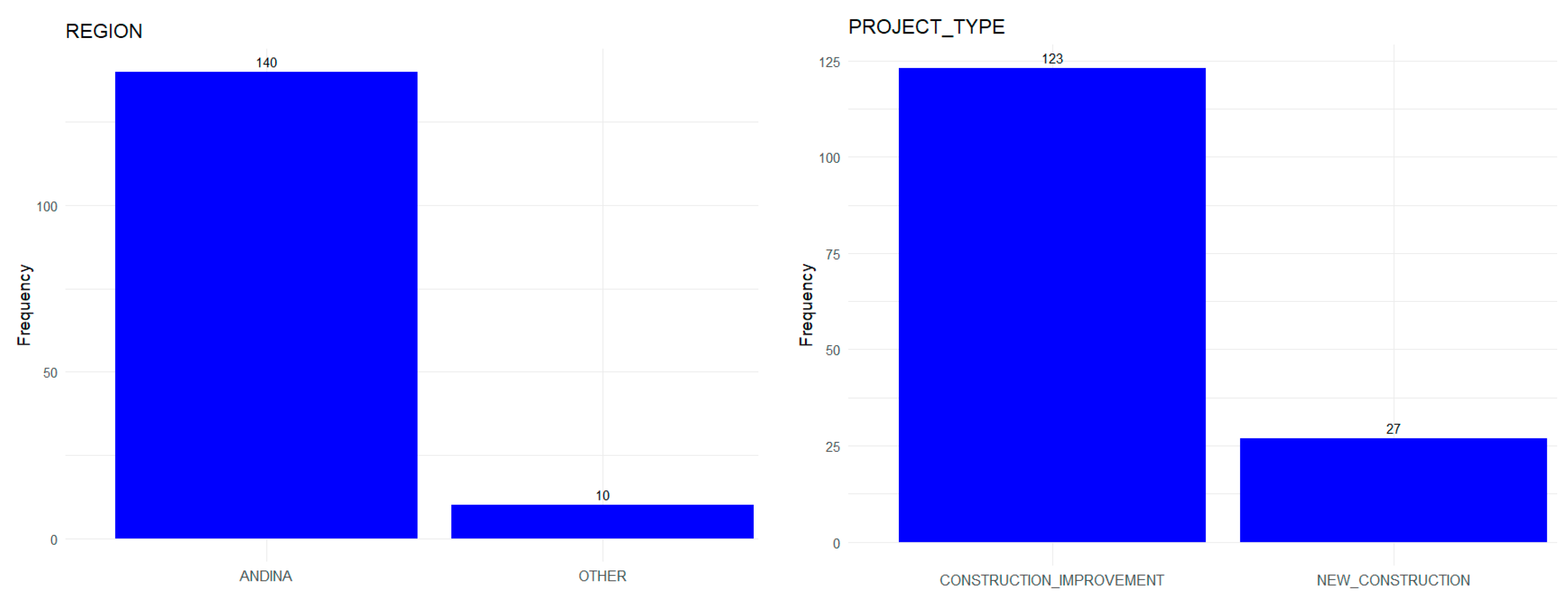Figure 4 illustrates the variability in frequencies across these variables, revealing significant differences. The categorical variables encompass elements of diverse nature, including year of execution, region, type of procurement, and type of project. Regarding the year of execution, there is a peak in 2020 with 63 projects, followed by 2021 with 42, which may reflect an increase in investment in educational infrastructure during that period. As for the type of process, most projects were awarded through abbreviated selection (89), followed by public bidding (56), while direct contracting was infrequent (6), suggesting a preference for more competitive mechanisms. In Colombia contracting processes included competitive bidding, in which a contractor is selected in equal opportunities; abbreviated selection, a simplified process carried out after a public tender has been declared void; and minimum contract, the quickest and most straightforward procedure for low contract values [