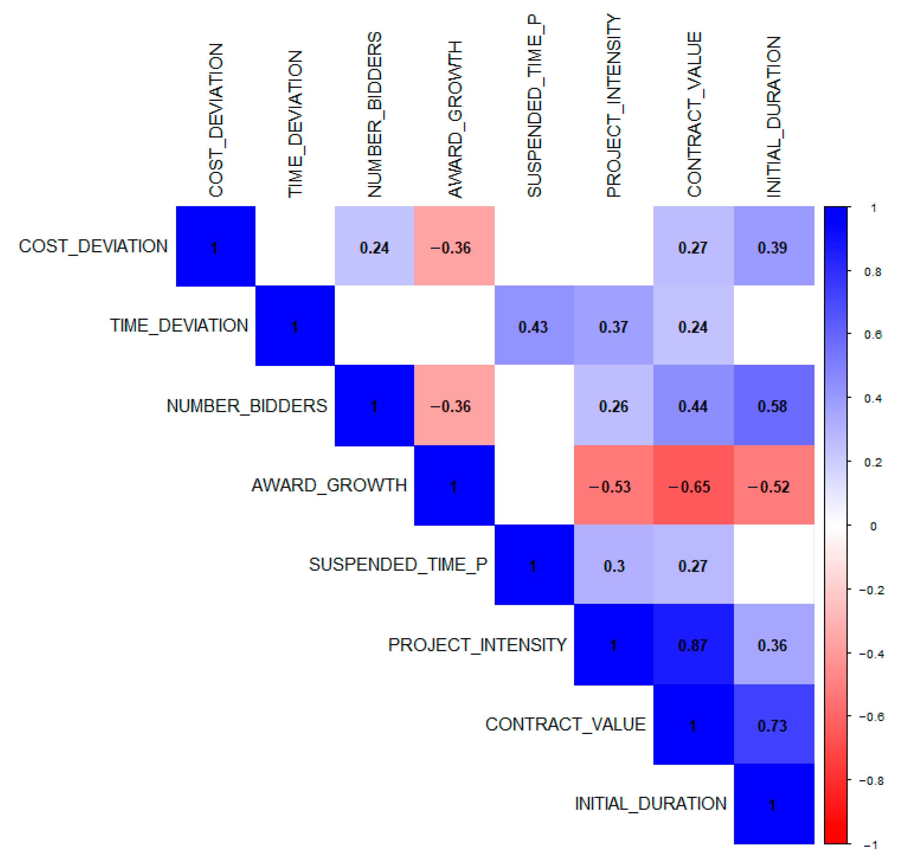 Regarding TIME_DEVIATION, a positive correlation is observed with SUSPENDED_TIME_P, showing the highest value (0.43). This suggests that longer suspension periods are associated with greater delays in project completion, indicating that suspensions significantly disrupt project timelines and lead to extended durations beyond the original schedule. A positive correlation is also found with PROJECT_INTENSITY (0.37), suggesting that projects with higher financial intensity per unit of time tend to experience greater delays. This may imply that high-pressure projects—those requiring significant execution within tight timeframes—are more prone to time overruns.