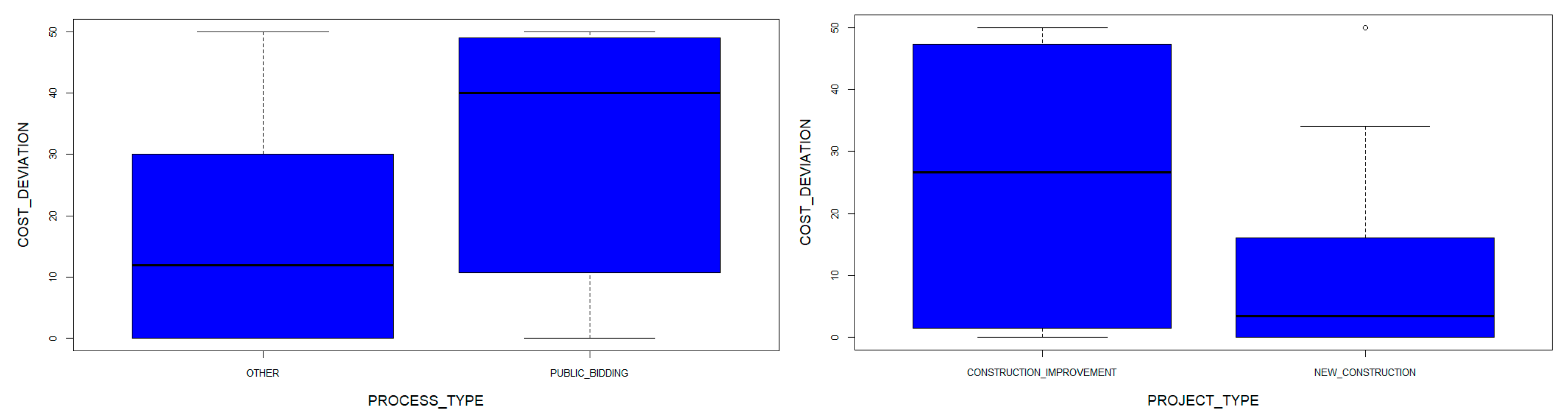 49]. This process included: (i) Descriptive statistics to summarize central tendencies and dispersion for key numerical variables such as Contract Value, Cost and Time Deviations; (ii) Visualizations such as boxplots were generated to explore the distribution of both numerical and categorical variables; (iii) Boxplots were used to visualize distributions and identify extreme outliers based on the interquartile range (IQR); observations outside the bounds defined by Q1 − 3 × IQRQ1 − 3 × IQR and Q3 + 3 × IQRQ3 + 3 × IQR were excluded to improve model robustness [