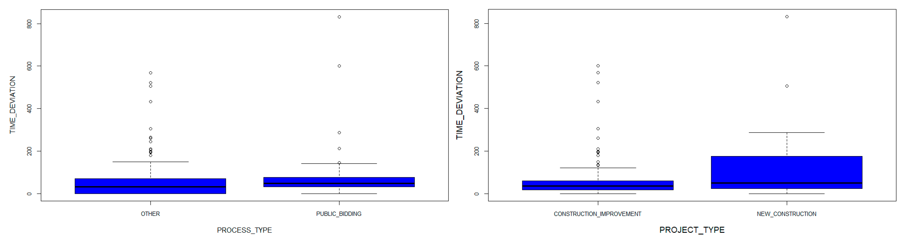Table 6, which confirms the same variables as previously identified. Regarding process type, the data shows that public bidding contracts (highlighted in red) have a median time deviation of (49.45) and a mean of (83.89)., Regarding PROJECT TYPE, new construction projects reported substantially higher values (highlighted in red), with a median time deviation of (51.80) and a mean of (133.41), indicating a greater tendency for delays. This result contrasts with the cost deviation pattern, where construction improvement projects showed higher overruns.
