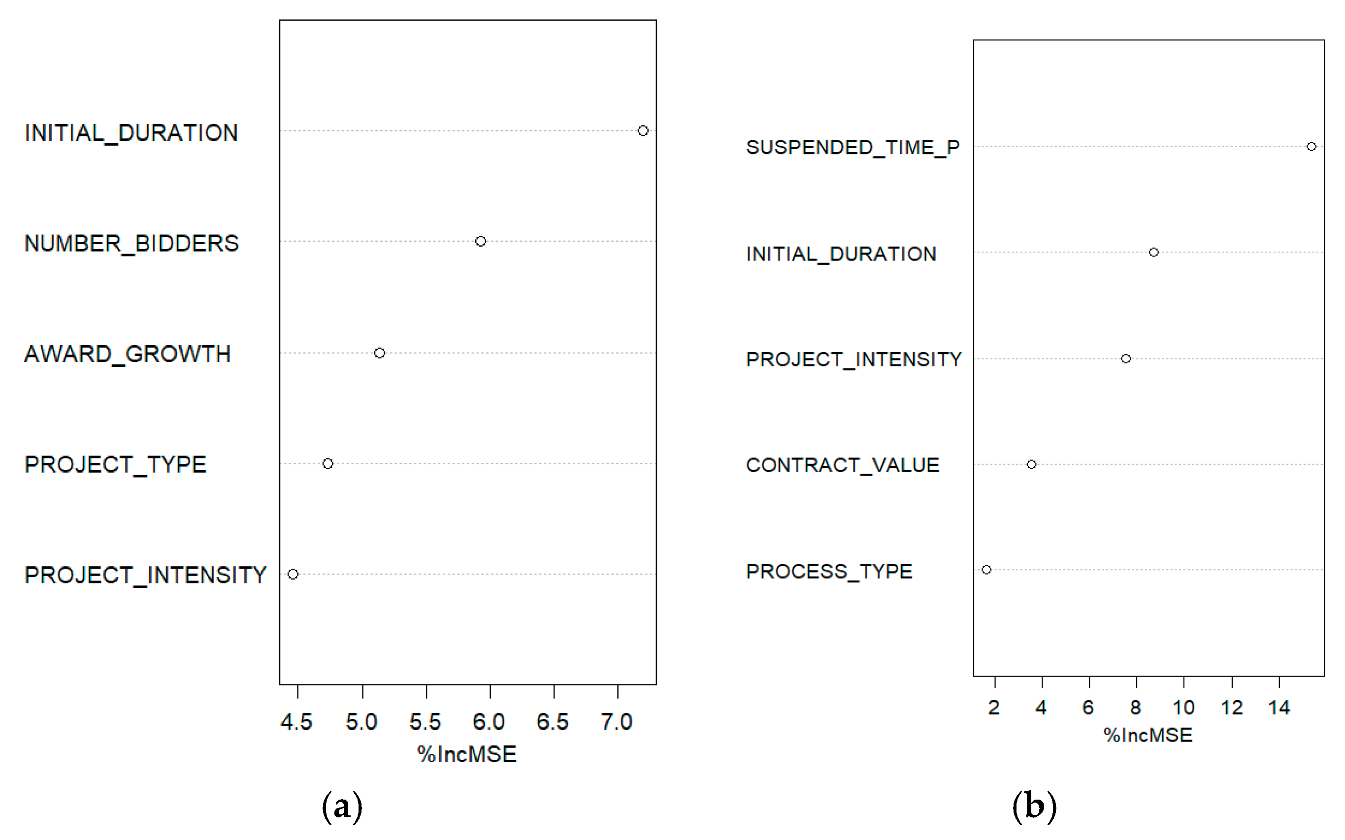 While Random Forest is commonly employed as a predictive modeling technique, in this study it was used primarily as a tool for ranking variable importance, rather than for building a high-performing predictive model. Given the relatively small sample size (150 finalized contracts), the objective was not to achieve predictive accuracy but to uncover non-linear relationships and assess the relative influence of each variable on cost and time deviations. The variable importance measures derived from Random Forest—such as Mean Decrease in Accuracy—are widely recognized for their robustness in exploratory analyses and feature selection, even when predictive performance is not the primary goal [
