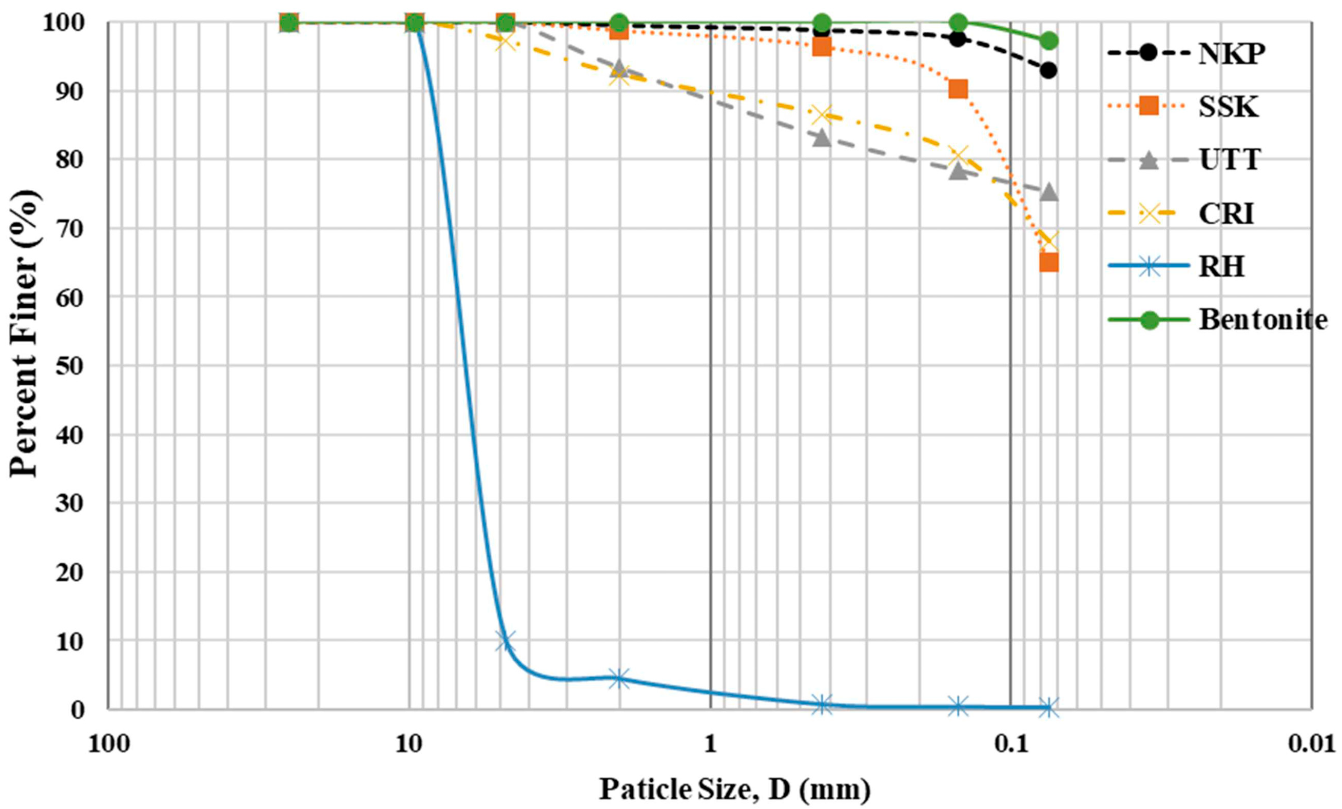 25]. Rice husk was added to the Chiang Rai flood sediment (CRI) to enable comparability. Initial findings, nevertheless, showed that they were not strong enough when used alone. Therefore, bentonite was added as a second stabilizer to see whether rice husk, bentonite or the mixture of both could convert the sediment to a construction grade material.