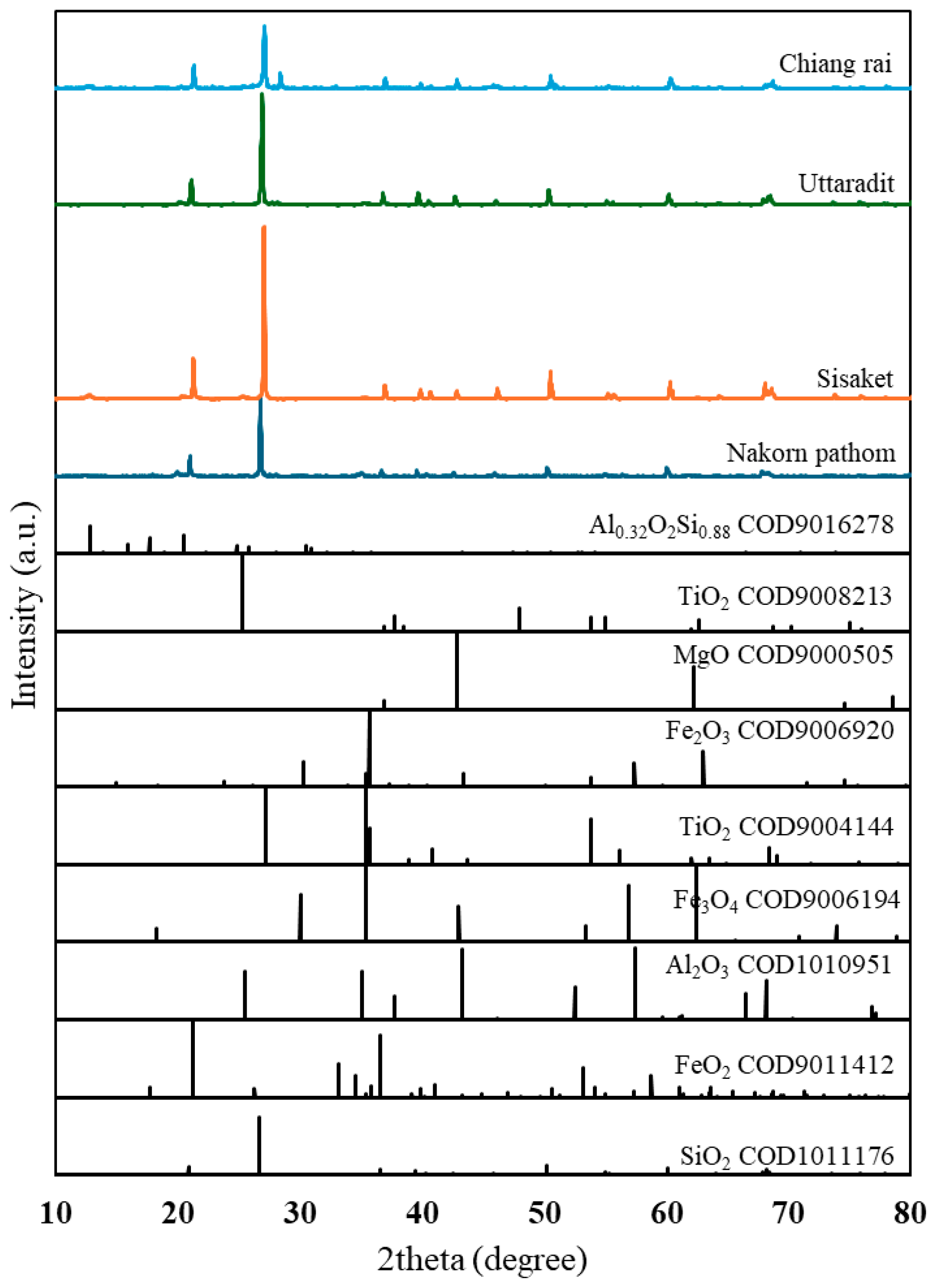 Sisaket soil had similar compressive strength (1.13 ± 0.05 MPa) and intermediate flexural resistance (0.09 ± 0.01 MPa) and intermediate thermal conductivity (0.298 ± 0.043 W/m·K). The reported TiO