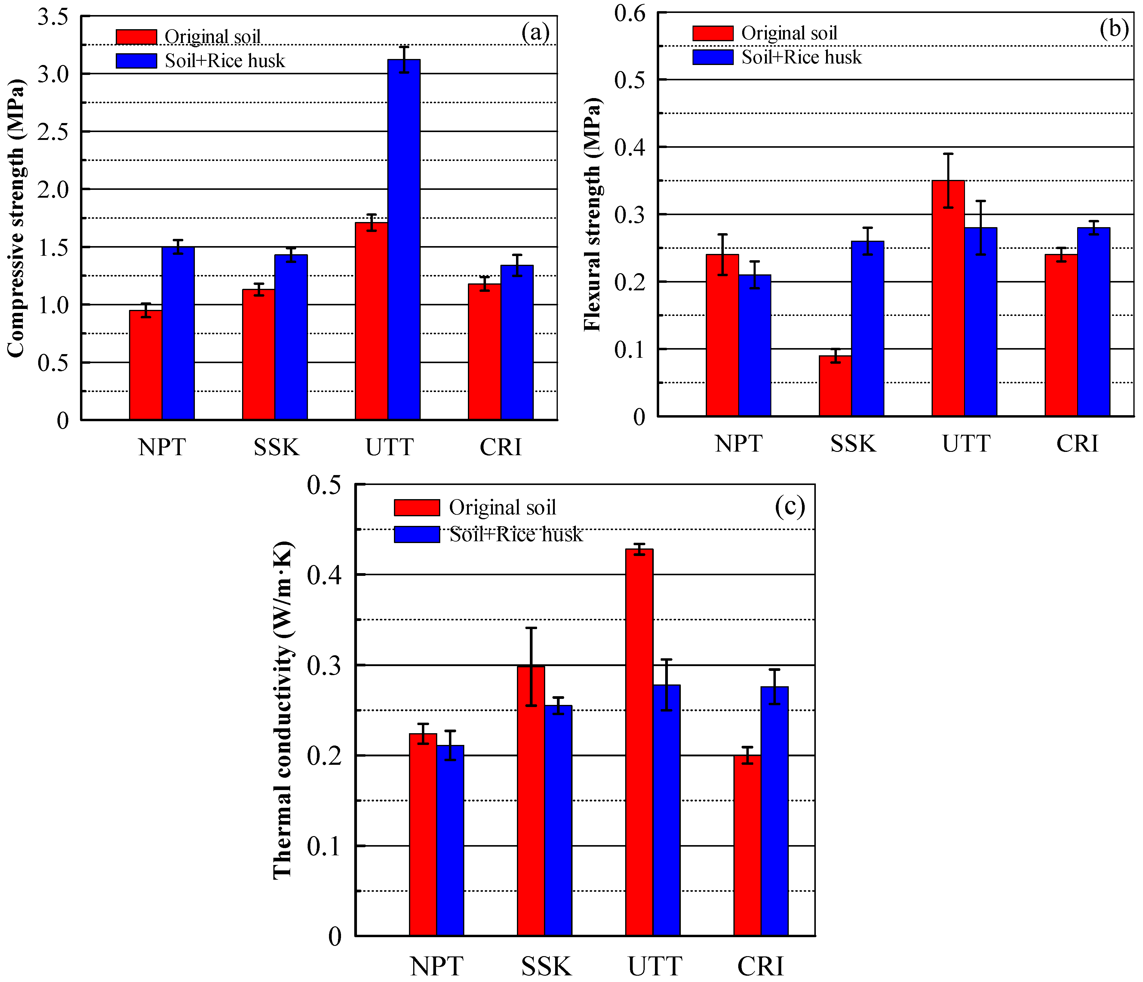 Rice husk addition significantly enhanced adobe performance across all soil types, with the magnitude of improvement correlating with soil mineralogy and baseline material characteristics (