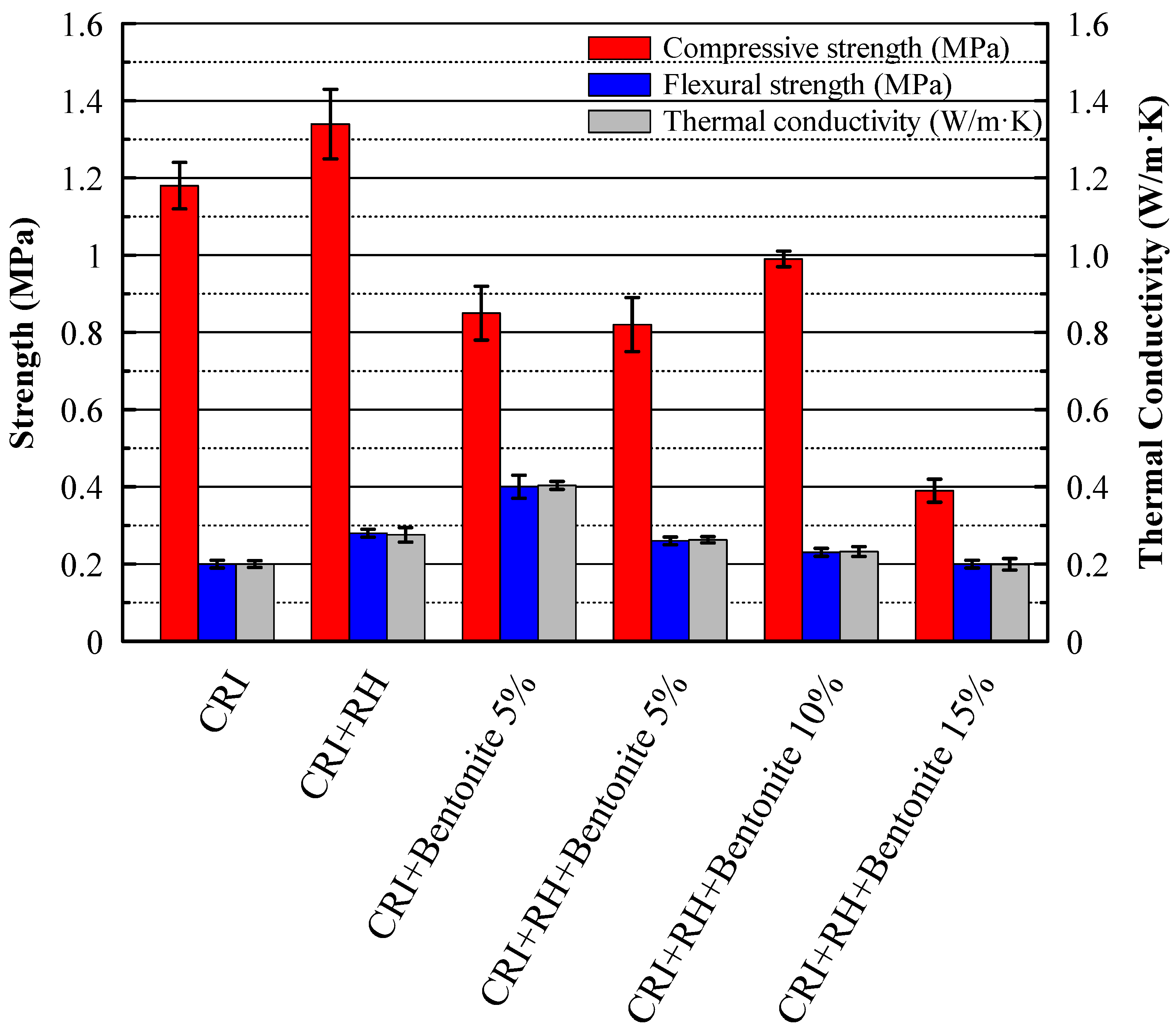 Figure 12). The results of individual additives were opposite: the addition of rice husk (CRI+RH) resulted in an optimal compressive strength of 1.34 ± 0.09 MPa along with a thermal conductivity of 0.276 ± 0.019 W/m·K, and the addition of bentonite (CRI + B5) enhanced flexural strength to 0.40 ± 0.04 MPa, but decreased compressive strength to 0.85 ± 0.07 MPa and increased thermal conductivity to 0.404 ± 0.010 W/m·K. Dual-additive systems allowed balancing between the mechanical and thermal spectrum: CRI + RH + B5 had intermediate properties (0.82 ± 0.07 MPa compressive, 0.26 ± 0.01 MPa flexural, 0.263 ± 0.008 W/m·K thermal conductivity); CRI + RH + B10 had balanced properties (0.99 ± 0.02 MPa compressive, 0.23 ± 0.01 MPa flexural, 0.232 ± 0.013 W/m·K).