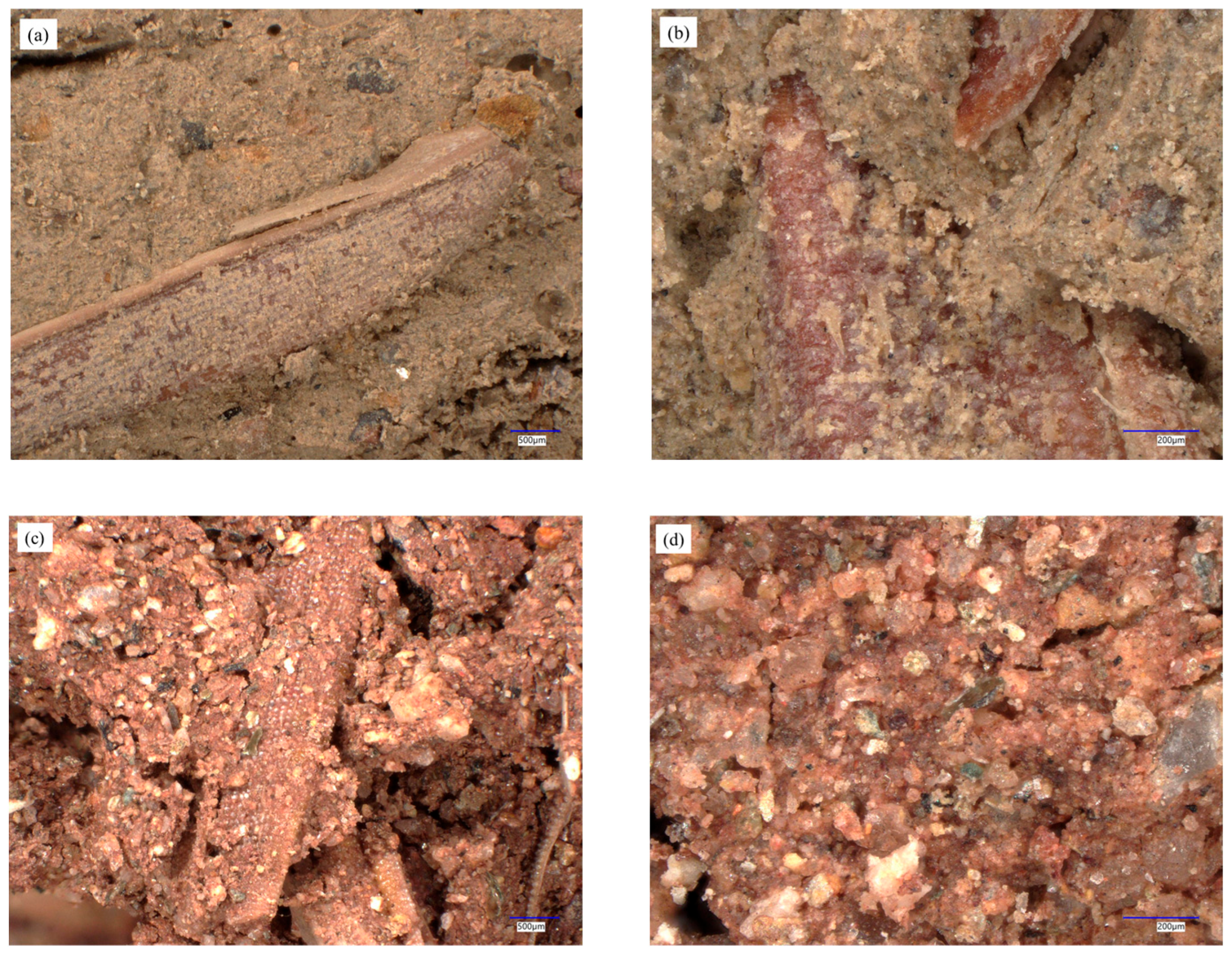 Figure 13a,b). The rice husk particles, ranging from 0.15 to 4.0 mm in length, formed a three-dimensional reinforcing network within the soil matrix. However, substantial void spaces were observed between matrix particles, and fiber-matrix adhesion varied significantly across the sample. Poor interfacial bonding in several regions correlates directly with the modest 13.6% compressive strength improvement compared to other soil types, while the abundant air voids explain the moderate thermal conductivity reduction to 0.276 ± 0.019 W/m·K.