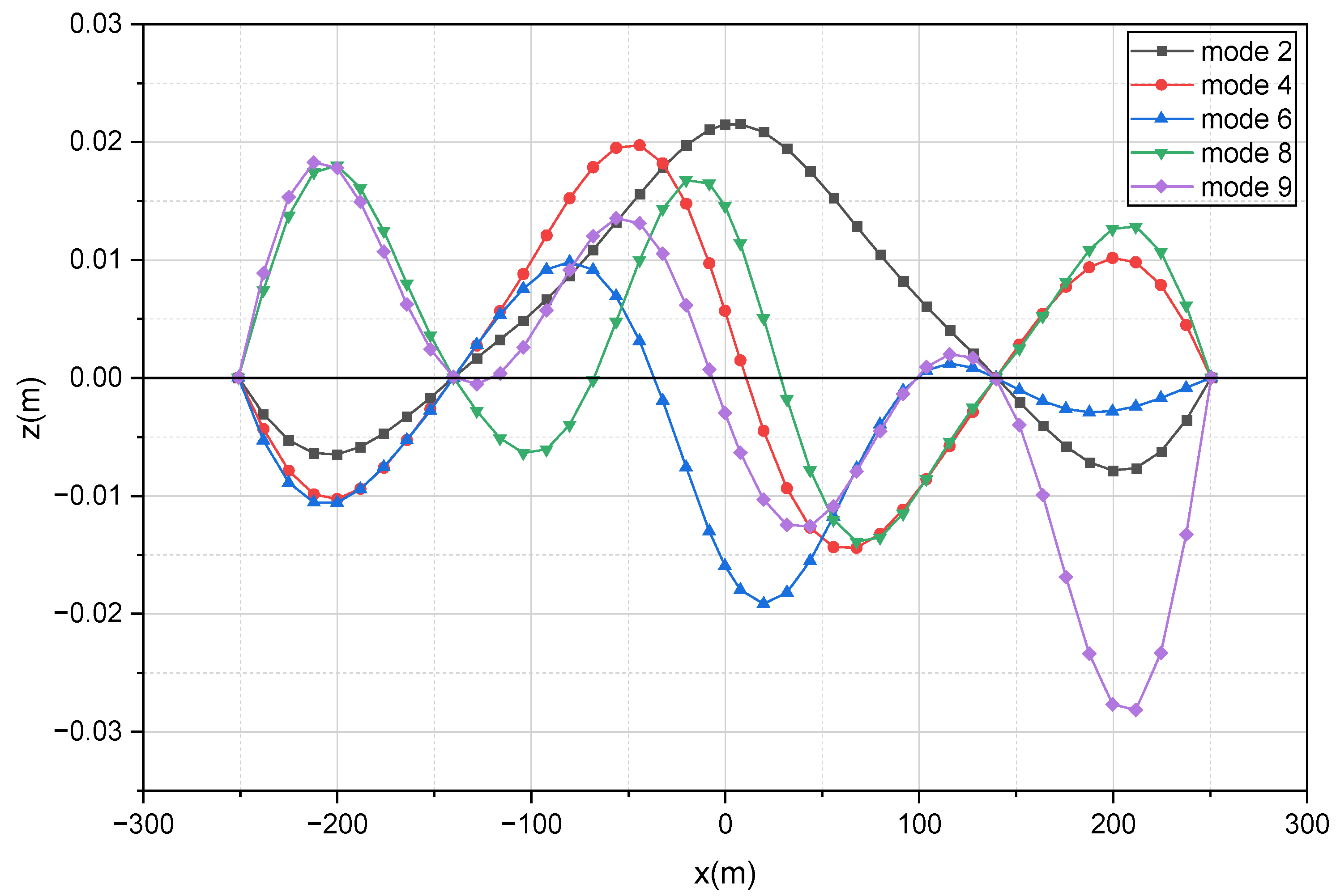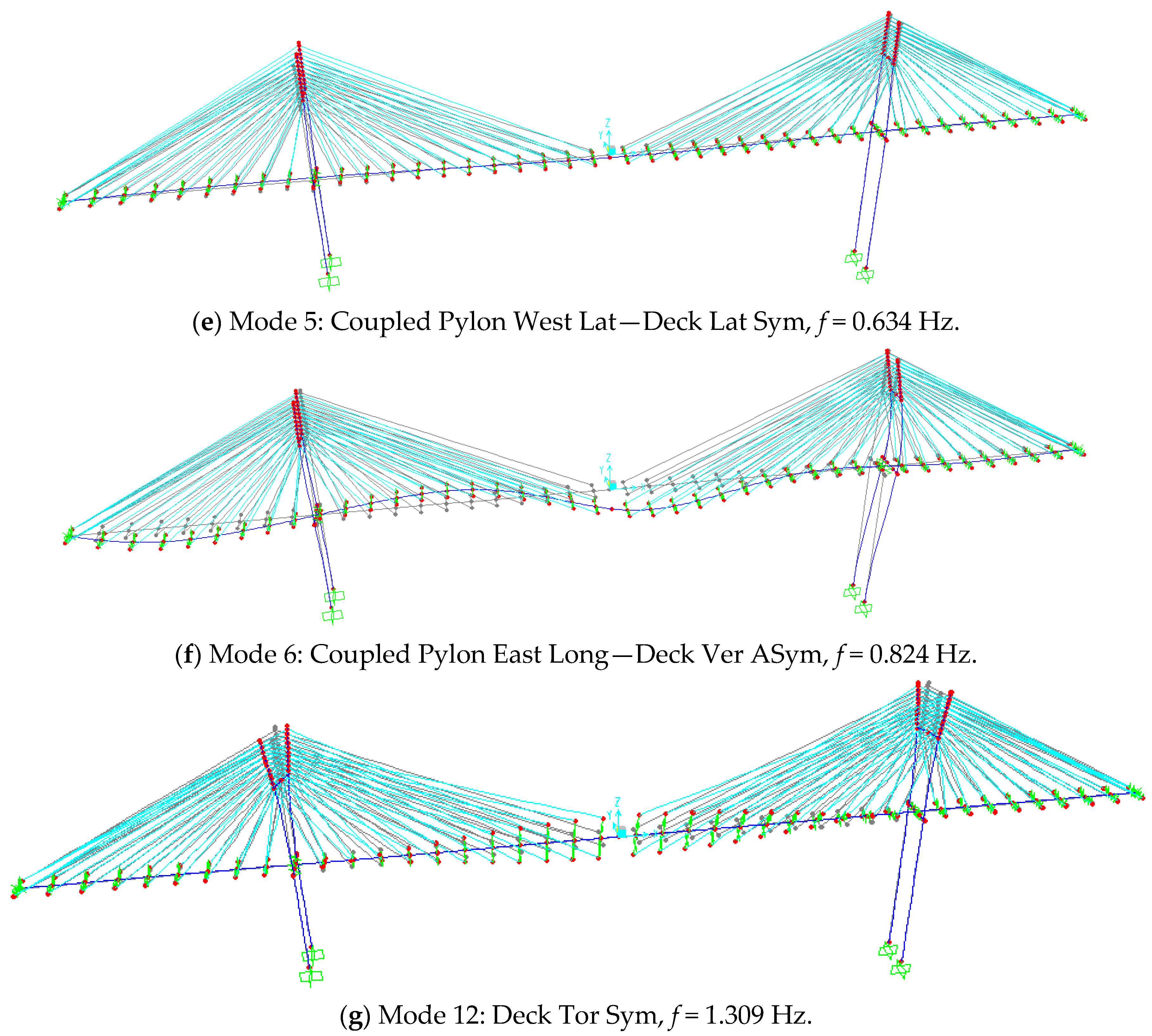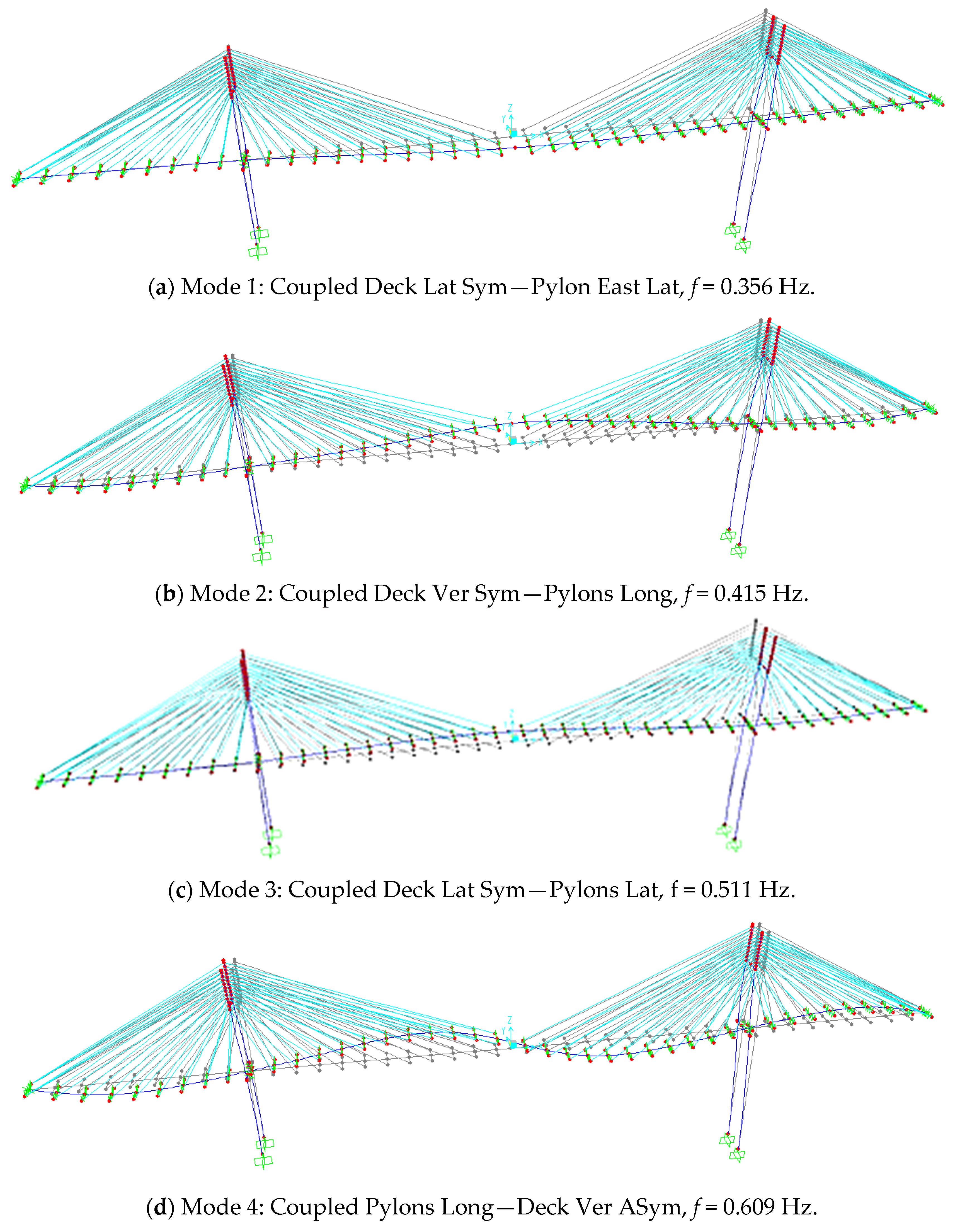 - Kumar, S.; Nallasivam, K. Modal analysis of natural dynamic frequency for a double deck cable-stayed steel bridge by using finite element method. Discov. Civ. Eng. 2024, 1, 115. [Google Scholar] [CrossRef]