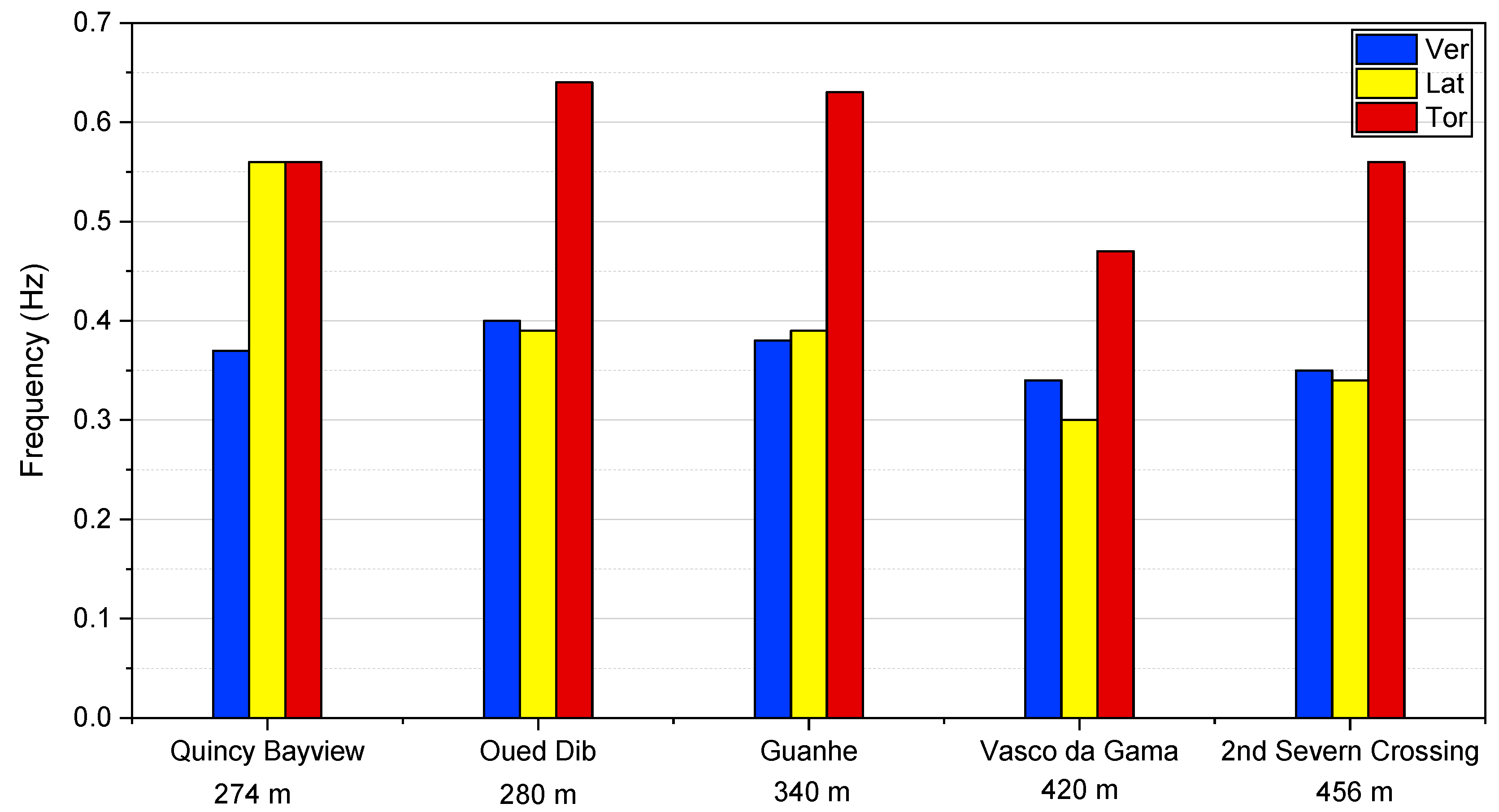 N° | Name | Country | Deck Material | Main Span L (m) | Side Spans L′ (m) | Deck Wide B (m) | 1st Vert Mode (Hz) | 1st Lat Mode (Hz) | 1st Tor Mode (Hz) |
