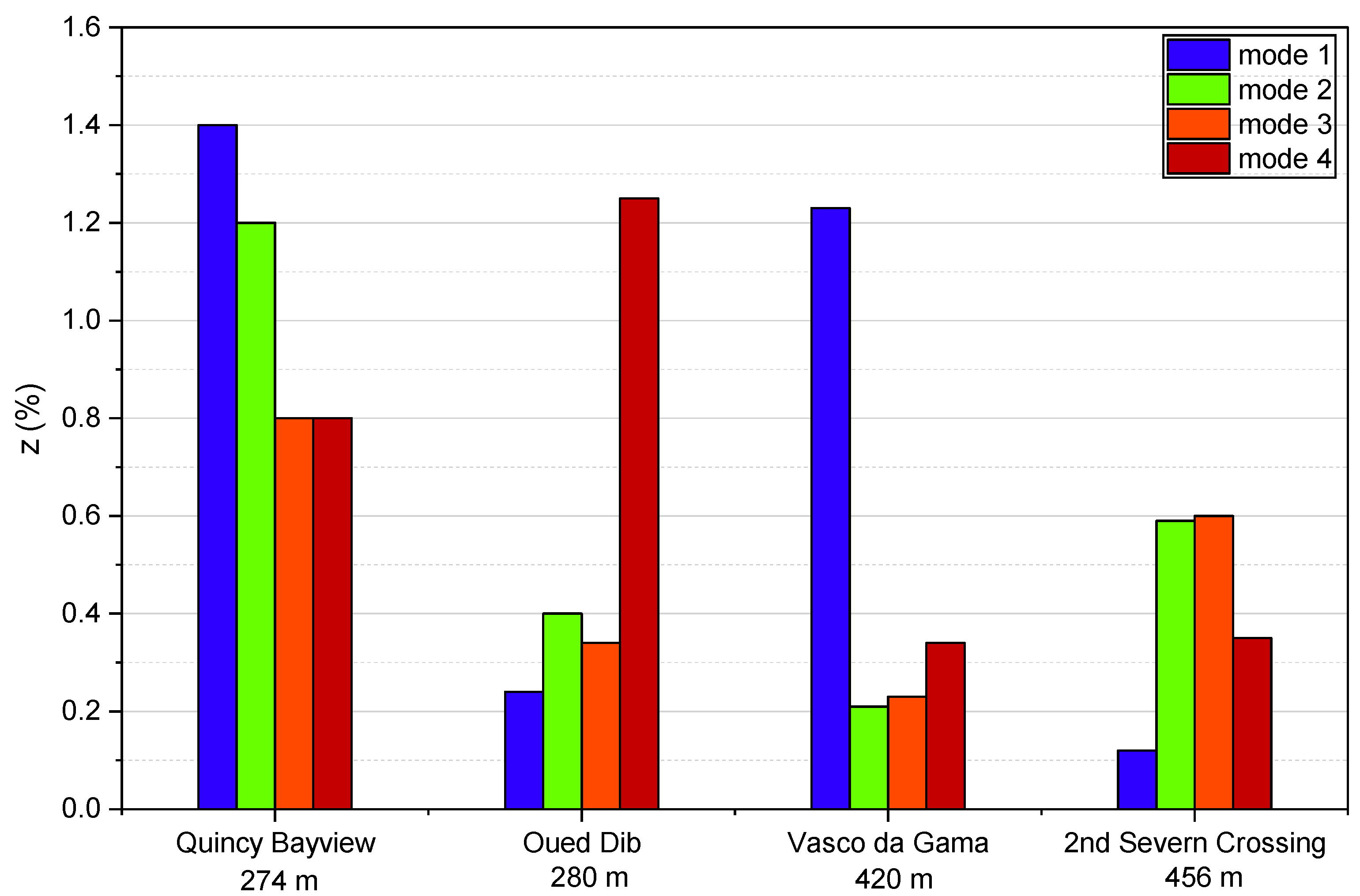 - Cable-stayed bridges exhibit low structural damping, which makes them vulnerable to wind effects. In addition, this type of structure shows strong coupling between vibration modes, which makes it impossible to use Rayleigh’s law to calculate modal damping.